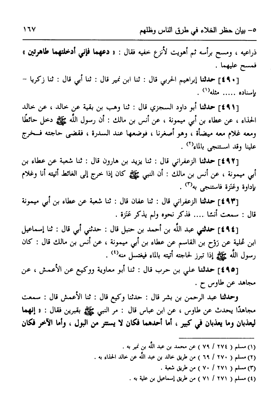495 - حَدَّثَنَا عَلِيُّ بْنُ حَرْبٍ قَالَ: ثنا أَبُو مُعَاوِيَةَ، وَوَكِيعٌ، عَنِ الْأَعْمَشِ، عَنْ مُجَاهِدٍ، عَنْ طَاوُسٍ ح، وَحَدَّثَنَا عَبْدُ الرَّحْمَنِ بْنُ بِشْرٍ قَالَ: حَدَّثَنَا وَكِيعٌ قَالَ: ثنا الْأَعْمَشُ قَالَ: سَمِعْتُ مُجَاهِدًا يُحَدِّثُ، عَنْ طَاوُسٍ، عَنِ ابْنِ عَبَّاسٍ قَالَ: مَرَّ النَّبِيُّ صَلَّى اللهُ عَلَيْهِ وَسَلَّمَ بِقَبْرَيْنِ فَقَالَ: " §إِنَّهُمَا لَيُعَذَّبَانِ وَمَا يُعَذَّبَانِ فِي كَبِيرٍ، أَمَّا أَحَدُهُمَا: فَكَانَ لَا يَسْتَتِرُ مِنَ الْبَوْلِ، وَأَمَّا الْآخَرُ: فَكَانَ -[168]- يَمْشِي بِالنَّمِيمَةِ "، ثُمَّ أَخَذَ جَرِيدَةً رَطْبَةً فَشَقَّهَا بِنِصْفَيْنِ، وَغَرَزَ فِي كُلِّ قَبْرٍ وَاحِدَةً، فَقِيلَ: يَا رَسُولَ اللَّهِ، لِمَ صَنَعْتَ هَذَا؟ قَالَ: «لَعَلَّهُ أَنْ يُخَفِّفَ عَنْهُمَا مَا لَمْ يَيْبَسَا» وَاللَّفْظُ لِعَلِيٍّ.