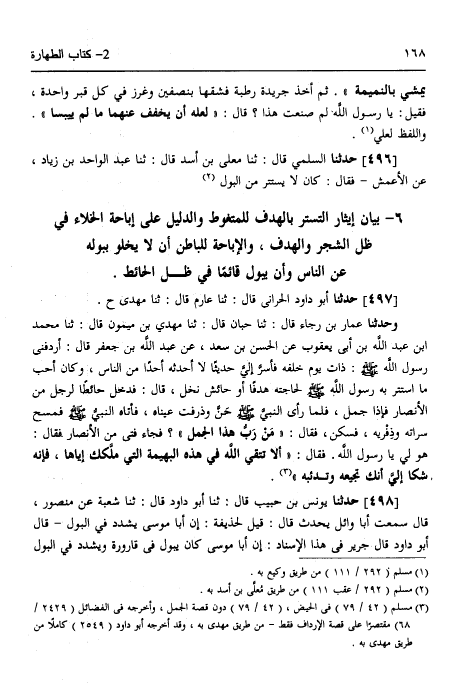 497 - حَدَّثَنَا أَبُو دَاوُدَ الْحَرَّانِيُّ قَالَ: ثنا عَارِمٌ قَالَ: ثنا مَهْدِيٌّ ح، وَحَدَّثَنَا عَمَّارُ بْنُ رَجَاءٍ قَالَ: ثنا حَبَّانُ قَالَ: ثنا مَهْدِيُّ بْنُ مَيْمُونٍ قَالَ: ثنا مُحَمَّدُ بْنُ عَبْدِ اللَّهِ بْنِ أَبِي يَعْقُوبَ، عَنِ الْحَسَنِ بْنِ سَعْدٍ، عَنْ عَبْدِ اللَّهِ بْنِ جَعْفَرٍ قَالَ: أَرْدَفَنِي رَسُولُ اللَّهِ صَلَّى اللهُ عَلَيْهِ وَسَلَّمَ ذَاتَ يَوْمٍ خَلْفَهُ، فَأَسَرَّ إِلَيَّ حَدِيثًا لَا أُحَدِّثُهُ أَحَدًا مِنَ النَّاسِ، " §وَكَانَ أَحَبُّ مَا اسْتَتَرَ بِهِ رَسُولُ اللَّهِ صَلَّى اللهُ عَلَيْهِ وَسَلَّمَ لِحَاجَتِهِ هَدَفًا أَوْ حَائِشَ نَخْلٍ، قَالَ: فَدَخَلَ حَائِطًا لِرَجُلٍ مِنَ الْأَنْصَارِ فَإِذَا جَمَلٌ، فَلَمَّا رَأَى النَّبِيَّ صَلَّى اللهُ عَلَيْهِ وَسَلَّمَ حَنَّ وَذَرَفَتْ عَيْنَاهُ، فَأَتَاهُ النَّبِيُّ صَلَّى اللهُ عَلَيْهِ وَسَلَّمَ، فَمَسَحَ سَرَاتَهُ وَذِفْرَيْهِ فَسَكَنَ، فَقَالَ: «مَنْ رَبُّ هَذَا الْجَمَلِ؟» فَجَاءَ فَتًى مِنَ الْأَنْصَارِ فَقَالَ: هُوَ لِي يَا رَسُولَ اللَّهِ، فَقَالَ: «أَلَا تَتَّقِي اللَّهَ فِي هَذِهِ الْبَهِيمَةِ الَّتِي مَلَّكَكَ إِيَّاهَا؛ فَإِنَّهُ شَكَا إِلَيَّ أَنَّكَ تُجِيعُهُ وَتُدْئِبُهُ»