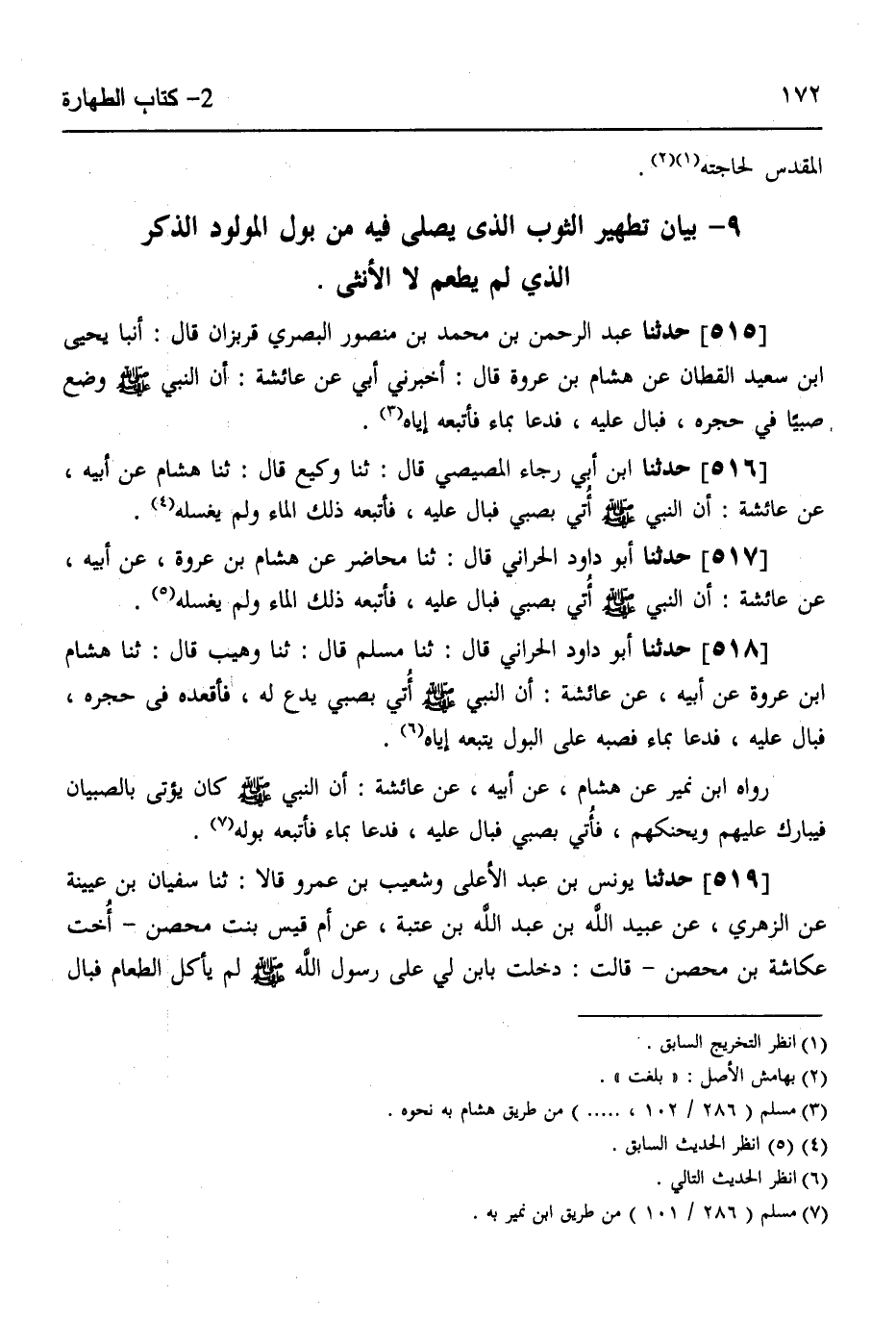 518 - حَدَّثَنَا أَبُو دَاوُدَ الْحَرَّانِيُّ قَالَ: ثَنَا مُسْلِمٌ قَالَ: ثَنَا وُهَيْبٌ قَالَ: ثَنَا هِشَامُ بْنُ عُرْوَةَ، عَنْ أَبِيهِ، عَنْ عَائِشَةَ، أَنَّ النَّبِيَّ صَلَّى اللهُ عَلَيْهِ وَسَلَّمَ «§أُتِيَ بِصَبِيٍّ يَدْعُ لَهُ فَأَقْعَدَهُ فِي حِجْرِهِ، فَبَالَ عَلَيْهِ فَدَعَا بِمَاءٍ فَصَبَّهُ عَلَى الْبَوْلِ يَتْبَعُهُ إِيَّاهُ»