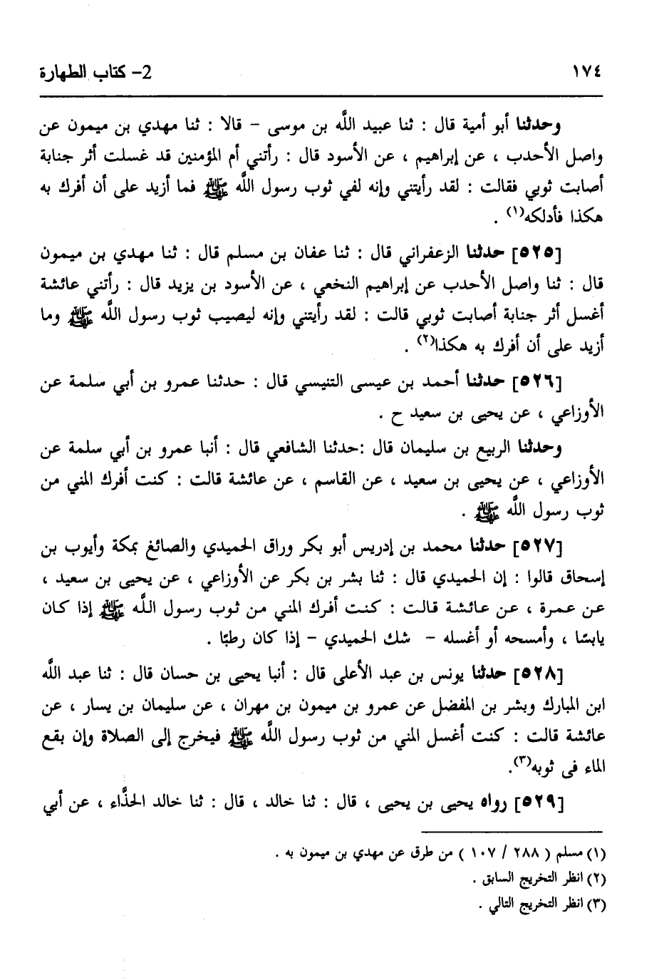 527 - حَدَّثَنَا مُحَمَّدُ بْنُ إِدْرِيسَ أَبُو بَكْرٍ وَرَّاقُ الْحُمَيْدِيِّ، وَالصَّائِغُ بِمَكَّةَ، وَأَيُّوبُ بْنُ إِسْحَاقَ قَالُوا: إِنَّ الْحُمَيْدِيَّ قَالَ: ثَنَا بِشْرُ بْنُ بَكْرٍ، عَنِ الْأَوْزَاعِيِّ، عَنْ يَحْيَى بْنِ سَعِيدٍ، عَنْ عَمْرَةَ، عَنْ عَائِشَةَ قَالَتْ: «§كُنْتُ أَفْرُكُ الْمَنِيَّ مِنْ ثَوْبِ رَسُولِ اللَّهِ صَلَّى اللهُ عَلَيْهِ وَسَلَّمَ إِذَا كَانَ يَابِسًا وَأَمْسَحُهُ - أَوْ أَغْسِلُهُ - شَكَّ الْحُمَيْدِيُّ - إِذَا كَانَ رَطْبًا»