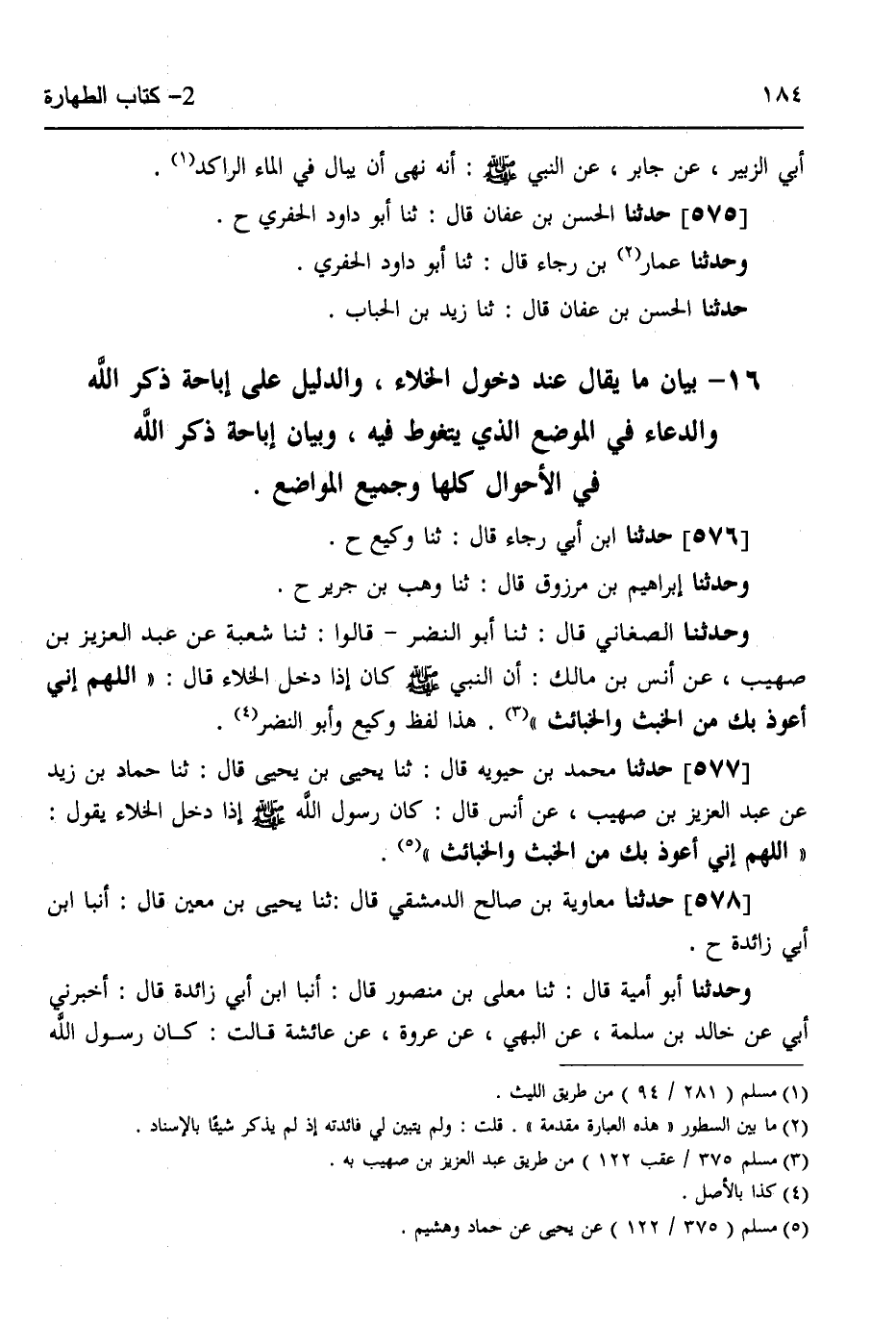 576 - حَدَّثَنَا ابْنُ أَبِي رَجَاءٍ قَالَ: ثَنَا وَكِيعٌ ح، وَحَدَّثَنَا إِبْرَاهِيمُ بْنُ مَرْزُوقٍ قَالَ: ثَنَا وَهْبُ بْنُ جَرِيرٍ ح، وَحَدَّثَنَا الصَّغَانِيُّ قَالَ: ثَنَا أَبُو النَّضْرِ قَالُوا: ثَنَا شُعْبَةُ، عَنْ عَبْدِ الْعَزِيزِ بْنِ صُهَيْبٍ، عَنْ أَنَسِ بْنِ مَالِكٍ، أَنَّ النَّبِيَّ صَلَّى اللهُ عَلَيْهِ وَسَلَّمَ كَانَ إِذَا دَخَلَ الْخَلَاءَ قَالَ: «§اللَّهُمَّ إِنِّي أَعُوذُ بِكَ مِنَ الْخُبُثِ وَالْخَبَائِثِ» هَذَا لَفْظُ وَكِيعٍ وَأَبِي النَّضْرِ