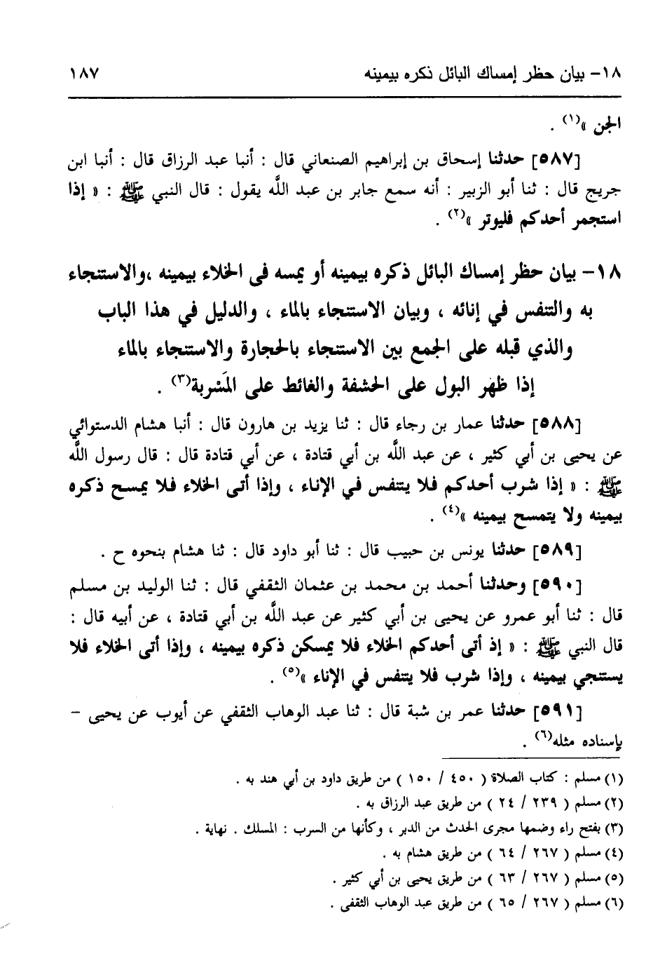 588 - حَدَّثَنَا عَمَّارُ بْنُ رَجَاءٍ قَالَ: ثَنَا يَزِيدُ بْنُ هَارُونَ قَالَ: أنبا هِشَامٌ الدَّسْتُوَائِيُّ، عَنْ يَحْيَى بْنِ أَبِي كَثِيرٍ، عَنْ عَبْدِ اللَّهِ، عَنْ أَبِي قَتَادَةَ قَالَ: قَالَ رَسُولُ اللَّهِ صَلَّى اللهُ عَلَيْهِ وَسَلَّمَ: «§إِذَا شَرِبَ أَحَدُكُمْ فَلَا يَتَنَفَّسْ فِي الْإِنَاءِ، وَإِذَا أَتَى الْخَلَاءَ فَلَا يَمْسَحْ ذَكَرَهُ بِيَمِينِهِ وَلَا يَتَمَسَّحْ بِيَمِينِهِ»