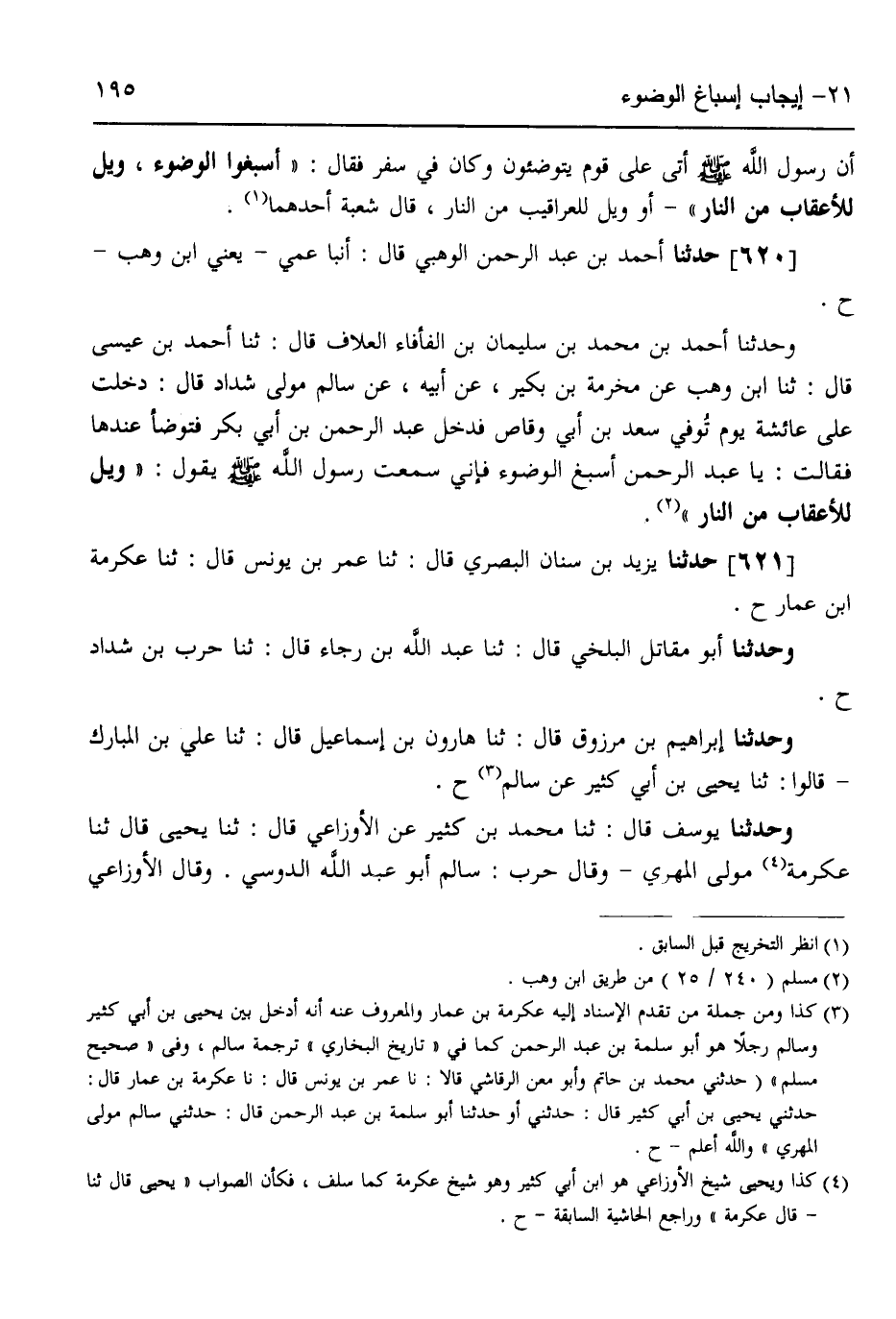 621 - حَدَّثَنَا يَزِيدُ بْنُ سِنَانٍ الْبَصْرِيُّ قَالَ: ثَنَا عَمْرُو بْنُ يُونُسَ قَالَ: ثَنَا عِكْرِمَةُ بْنُ عَمَّارٍ ح، وَحَدَّثَنَا أَبُو مُقَاتِلٍ الْبَلْخِيُّ قَالَ: ثَنَا عَبْدُ اللَّهِ بْنُ رَجَاءٍ قَالَ: ثَنَا حَرْبُ بْنُ شَدَّادٍ ح، وَحَدَّثَنَا إِبْرَاهِيمُ بْنُ مَرْزُوقٍ قَالَ: ثَنَا هَارُونُ بْنُ إِسْمَاعِيلَ قَالَ: ثَنَا عَلِيُّ بْنُ الْمُبَارَكِ، قَالُوا: ثَنَا يَحْيَى بْنُ أَبِي كَثِيرٍ، عَنْ سَالِمٍ ح، وَحَدَّثَنَا يُوسُفُ قَالَ: ثَنَا مُحَمَّدُ بْنُ كَثِيرٍ، عَنِ الْأَوْزَاعِيِّ قَالَ: ثَنَا يَحْيَى قَالَ: ثَنَا عِكْرِمَةُ مَوْلَى الْمَهْرِيِّ وَقَالَ حَرْبٌ: سَالِمُ أَبُو عَبْدِ اللَّهِ الدَّوْسِيُّ، وَقَالَ الْأَوْزَاعِيُّ -[196]- أَيْضًا: سَالِمٌ الدَّوْسِيُّ، وَقَالَ عَلِيُّ بْنُ الْمُبَارَكِ: سَالِمٌ، عَنْ عَائِشَةَ أَنَّهَا قَالَتْ لِعَبْدِ الرَّحْمَنِ بْنِ أَبِي بَكْرٍ: أَسْبِغِ الْوُضُوءَ فَإِنِّي سَمِعْتُ رَسُولَ اللَّهِ صَلَّى اللهُ عَلَيْهِ وَسَلَّمَ، يَقُولُ: «§وَيْلٌ لِلْأَعْقَابِ مِنَ النَّارِ»