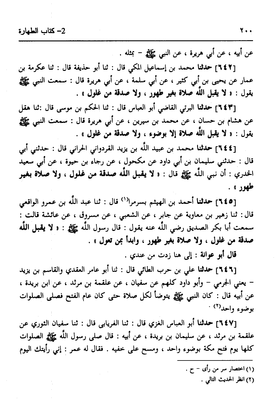 642 - حَدَّثَنَا مُحَمَّدُ بْنُ إِسْمَاعِيلَ الْمَكِّيُّ قَالَ: ثَنَا أَبُو حُذَيْفَةَ قَالَ: ثَنَا عِكْرِمَةُ بْنُ عَمَّارٍ، عَنْ يَحْيَى بْنِ أَبِي كَثِيرٍ، عَنْ أَبِي سَلَمَةَ، عَنْ أَبِي هُرَيْرَةَ قَالَ: سَمِعْتُ النَّبِيَّ صَلَّى اللهُ عَلَيْهِ وَسَلَّمَ يَقُولُ: «§لَا يَقْبَلُ اللَّهُ صَلَاةً بِغَيْرِ طَهُورٍ، وَلَا صَدَقَةً مِنْ غُلُولٍ»