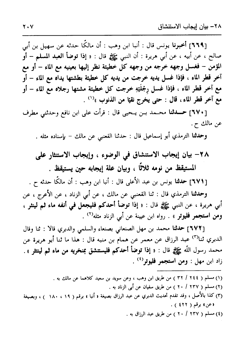 671 - حَدَّثَنَا يُونُسُ بْنُ عَبْدِ الْأَعْلَى قَالَ: أنبا ابْنُ وَهْبٍ، أَنَّ مَالِكًا، حَدَّثَهُ ح، وَحَدَّثَنَا التِّرْمِذِيُّ، قَالَ: ثَنَا الْقَعْنَبِيُّ، عَنْ مَالِكٍ، عَنْ أَبِي الزِّنَادِ، عَنِ الْأَعْرَجِ، عَنْ أَبِي هُرَيْرَةَ عَنِ النَّبِيِّ صَلَّى اللهُ عَلَيْهِ وَسَلَّمَ قَالَ: «§إِذَا تَوَضَّأَ أَحَدُكُمْ فَلْيَجْعَلْ فِي أَنْفِهِ مَاءً ثُمَّ لِيَنْثُرْ، وَمَنِ اسْتَجْمَرَ فَلْيُوتِرْ» رَوَاهُ ابْنُ عُيَيْنَةَ، عَنْ أَبِي الزِّنَادِ مِثْلَهُ