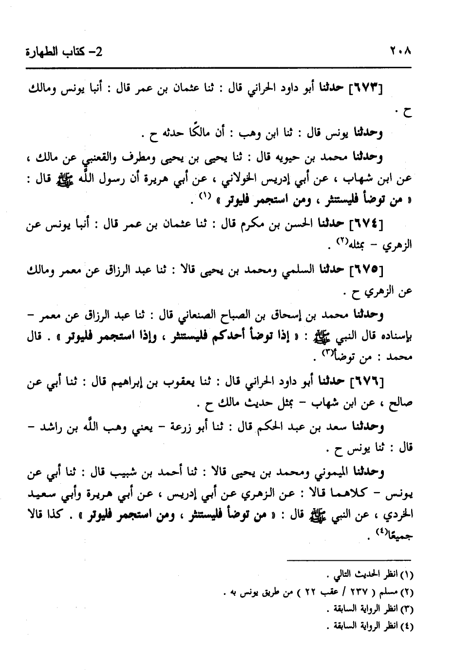 673 - حَدَّثَنَا أَبُو دَاوُدَ الْحَرَّانِيُّ قَالَ: ثَنَا عُثْمَانُ بْنُ عُمَرَ قَالَ: أنبا يُونُسُ، وَمَالِكٌ ح، وَحَدَّثَنَا يُونُسُ قَالَ: ثَنَا ابْنُ وَهْبٍ، أَنَّ مَالِكًا حَدَّثَهُ ح، وَحَدَّثَنَا مُحَمَّدُ بْنُ حَيَّوَيْهِ قَالَ: ثَنَا يَحْيَى بْنُ يَحْيَى، وَمُطَرِّفٌ، وَالْقَعْنَبِيُّ، عَنْ مَالِكٍ، عَنِ ابْنِ شِهَابٍ، عَنْ أَبِي إِدْرِيسَ الْخَوْلَانِيِّ، عَنْ أَبِي هُرَيْرَةَ، أَنَّ رَسُولَ اللَّهِ صَلَّى اللهُ عَلَيْهِ وَسَلَّمَ قَالَ: «§مَنْ تَوَضَّأَ فَلْيَسْتَنْثِرْ، وَمَنِ اسْتَجْمَرَ فَلْيُوتِرْ»