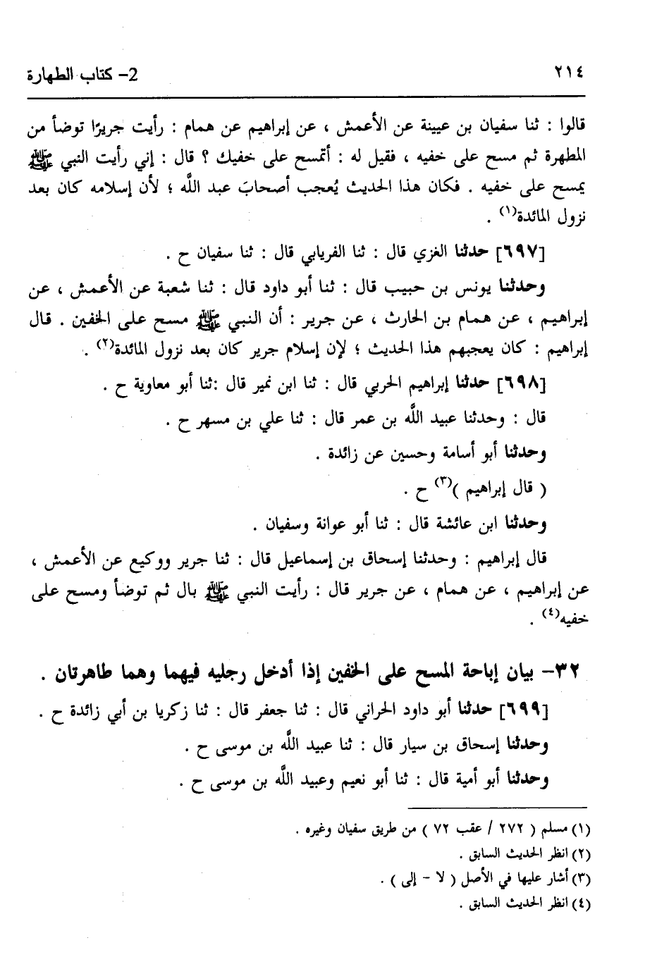 698 - حَدَّثَنَا إِبْرَاهِيمُ الْحَرْبِيُّ قَالَ: ثَنَا ابْنُ نُمَيْرٍ قَالَ: ثَنَا أَبُو مُعَاوِيَةَ ح قَالَ: وَحَدَّثَنَا عُبَيْدُ اللَّهِ بْنُ عُمَرَ قَالَ: ثَنَا عَلِيُّ بْنُ مُسْهِرٍ ح، وَحَدَّثَنَا أَبُو أُسَامَةَ، وَحُسَيْنٌ، عَنْ زَائِدَةَ قَالَ إِبْرَاهِيمُ ح، وَحَدَّثَنَا ابْنُ عَائِشَةَ قَالَ: ثَنَا أَبُو عَوَانَةَ، وَسُفْيَانُ قَالَ إِبْرَاهِيمُ: وَحَدَّثَنَا إِسْحَاقُ بْنُ إِسْمَاعِيلَ قَالَ: ثَنَا جَرِيرٌ، وَوَكِيعٌ، عَنِ الْأَعْمَشِ، عَنْ إِبْرَاهِيمَ، عَنْ هَمَّامٍ، عَنْ جَرِيرٍ قَالَ: «رَأَيْتُ النَّبِيَّ صَلَّى اللهُ عَلَيْهِ وَسَلَّمَ §بَالَ ثُمَّ تَوَضَّأَ وَمَسَحَ عَلَى خُفَّيْهِ»