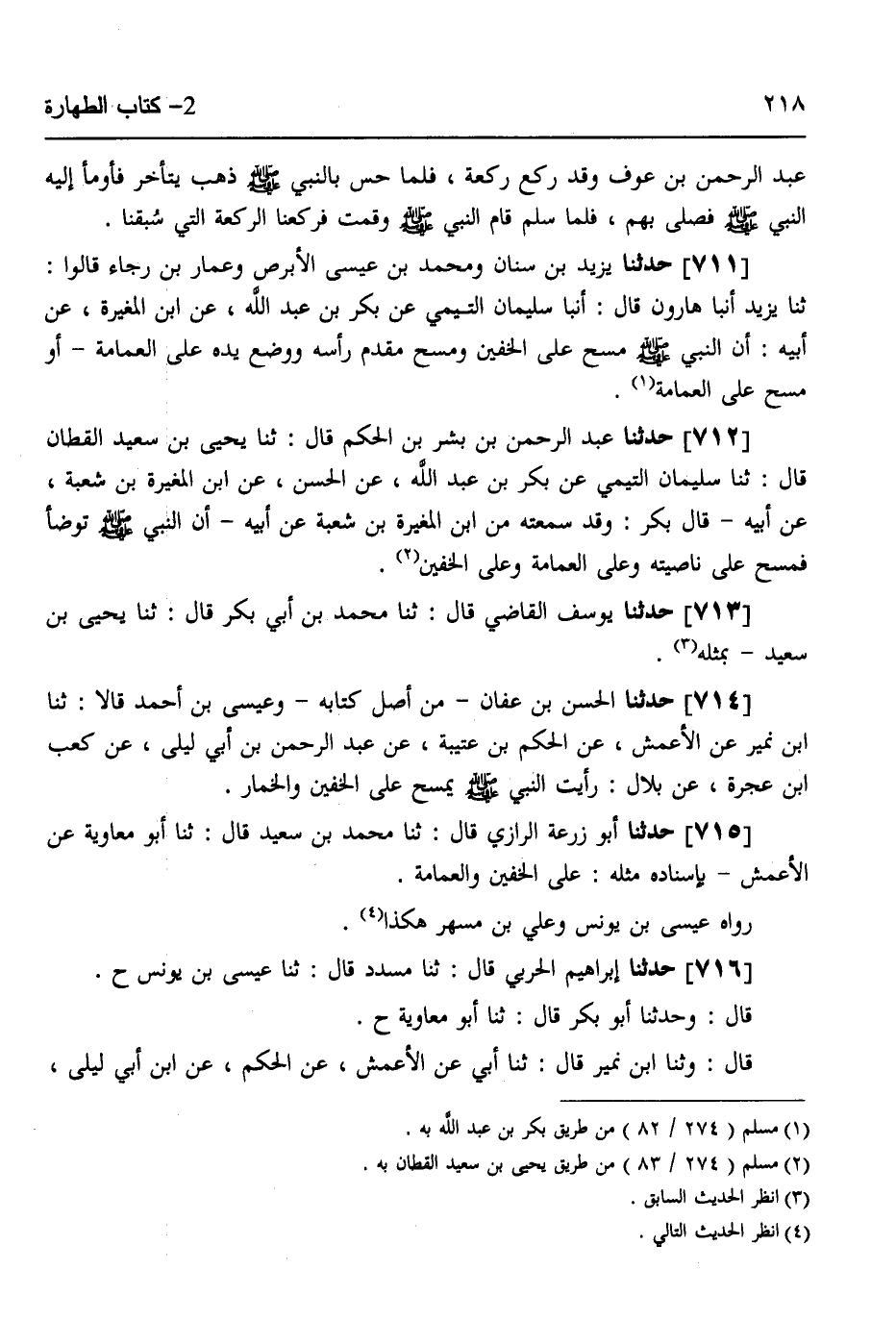 712 - حَدَّثَنَا عَبْدُ الرَّحْمَنِ بْنُ بِشْرِ بْنِ الْحَكَمِ قَالَ: ثَنَا يَحْيَى بْنُ سَعِيدٍ الْقَطَّانُ قَالَ: ثَنَا سُلَيْمَانُ التَّيْمِيُّ، عَنْ بَكْرِ بْنِ عَبْدِ اللَّهِ، عَنِ الْحَسَنِ، عَنْ ابْنِ الْمُغِيرَةِ بْنِ شُعْبَةَ، عَنْ أَبِيهِ قَالَ بَكْرٌ: وَقَدْ سَمِعْتُهُ مِن ابْنِ الْمُغِيرَةِ بْنِ شُعْبَةَ، عَنْ أَبِيهِ، أَنَّ النَّبِيَّ صَلَّى اللهُ عَلَيْهِ وَسَلَّمَ «§تَوَضَّأَ فَمَسَحَ عَلَى نَاصِيَتِهِ، وَعَلَى الْعِمَامَةِ وَعَلَى الْخُفَّيْنِ»