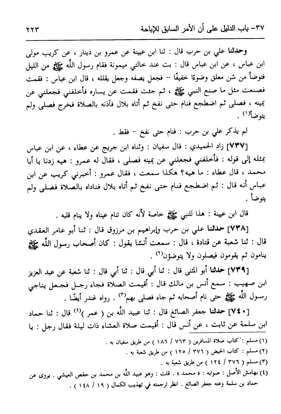 738 - حَدَّثَنَا عَلِيُّ بْنُ حَرْبٍ، وَإِبْرَاهِيمُ بْنُ مَرْزُوقٍ قَالَ: ثَنَا أَبُو عَامِرٍ الْعَقَدِيُّ قَالَ: ثَنَا شُعْبَةُ، عَنْ قَتَادَةَ قَالَ: سَمِعْتُ أَنَسًا يَقُولُ: «§كَانَ أَصْحَابُ رَسُولِ اللَّهِ صَلَّى اللهُ عَلَيْهِ وَسَلَّمَ يَنَامُونَ، ثُمَّ يَقُومُونَ فَيُصَلُّونَ وَلَا يَتَوَضَّؤُنَ»