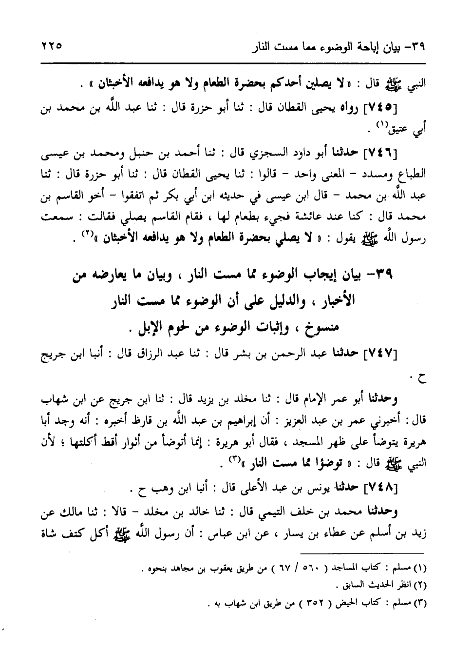748 - حَدَّثَنَا يُونُسُ بْنُ عَبْدِ الْأَعْلَى قَالَ: أنبا ابْنُ وَهْبٍ ح، وَحَدَّثَنَا مُحَمَّدُ بْنُ خَلَفٍ التَّيْمِيُّ قَالَ: ثَنَا خَالِدُ بْنُ مَخْلَدٍ قَالَا: ثَنَا مَالِكٌ، عَنْ زَيْدِ بْنِ أَسْلَمَ، عَنْ عَطَاءِ بْنِ يَسَارٍ، عَنِ ابْنِ عَبَّاسٍ، أَنَّ رَسُولَ اللَّهِ صَلَّى اللهُ عَلَيْهِ وَسَلَّمَ: «§أَكَلَ كَتِفَ شَاةٍ -[226]-، ثُمَّ صَلَّى وَلَمْ يَتَوَضَّأْ»