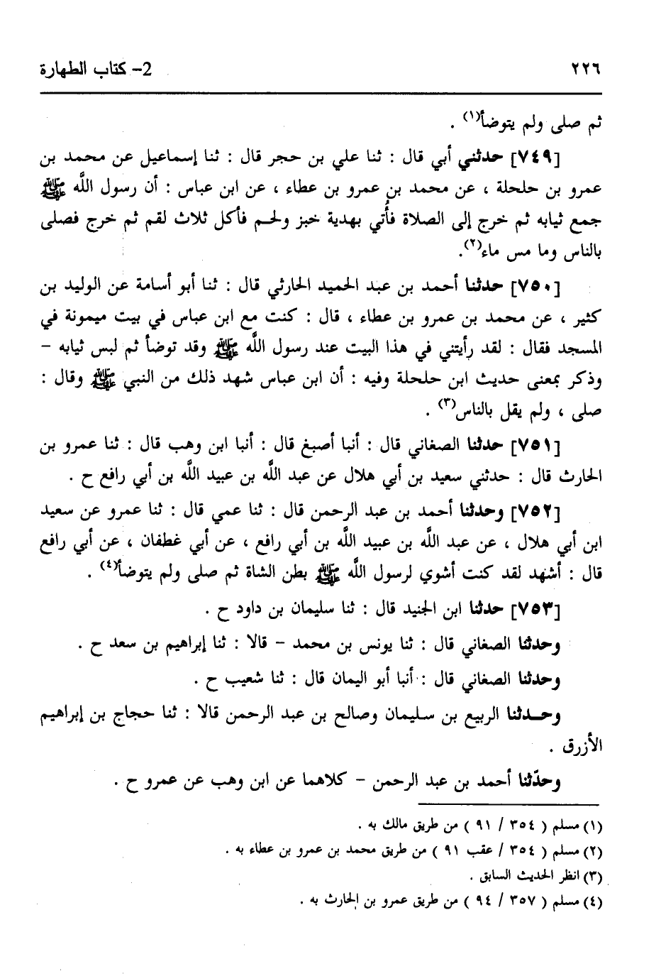 753 - حَدَّثَنَا ابْنُ الْجُنَيْدِ قَالَ: ثَنَا سُلَيْمَانُ بْنُ دَاوُدَ ح، وَحَدَّثَنَا الصَّغَانِيُّ قَالَ: ثَنَا يُونُسُ بْنُ مُحَمَّدٍ قَالَا: ثَنَا إِبْرَاهِيمُ بْنُ سَعْدٍ ح، وَحَدَّثَنَا الصَّغَانِيُّ قَالَ: أنبا أَبُو الْيَمَانِ قَالَ: ثَنَا شُعَيْبٌ ح، وَحَدَّثَنَا الرَّبِيعُ بْنُ سُلَيْمَانَ، وَصَالِحُ بْنُ عَبْدِ الرَّحْمَنِ قَالَا: ثَنَا حَجَّاجُ بْنُ إِبْرَاهِيمَ الْأَزْرَقُ، وَحَدَّثَنَا أَحْمَدُ بْنُ عَبْدِ الرَّحْمَنِ كِلَاهُمَا، عَنِ ابْنِ وَهْبٍ، عَنْ عَمْرٍو ح -[227]-، وَحَدَّثَنَا الدَّقِيقِيُّ، وَعَبَّاسٌ قَالَا: ثَنَا يَعْقُوبُ بْنُ إِبْرَاهِيمَ بْنِ سَعْدٍ قَالَ: ثَنَا أَبِي، عَنْ صَالِحٍ كُلُّهُمْ، عَنِ ابْنِ شِهَابٍ قَالَ: حَدَّثَنِي جَعْفَرُ بْنُ عَمْرِو بْنِ أُمَيَّةَ الضَّمْرِيُّ، عَنْ أَبِيهِ، «أَنَّهُ رَأَى رَسُولَ اللَّهِ صَلَّى اللهُ عَلَيْهِ وَسَلَّمَ §يَحْتَزُّ مِنْ كَتِفِ شَاةٍ يَحْتَزُّ مِنْهَا، ثُمَّ دُعِيَ إِلَى الصَّلَاةِ فَصَلَّى وَلَمْ يَتَوَضَّأْ» وَهَذَا لَفْظُ إِبْرَاهِيمَ بْنِ سَعْدٍ، عَنِ الزُّهْرِيِّ