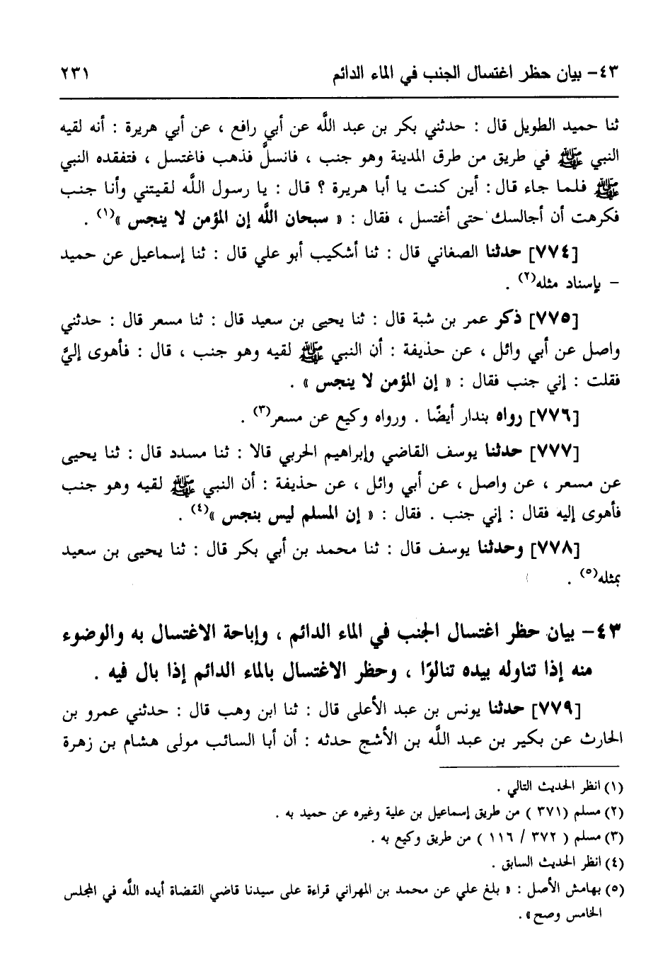 777 - حَدَّثَنَا يُوسُفُ الْقَاضِي، وَإِبْرَاهِيمُ الْحَرْبِيُّ قَالَا: ثَنَا مُسَدَّدٌ قَالَ: ثَنَا يَحْيَى، عَنْ مِسْعَرٍ، عَنْ وَاصِلٍ، عَنْ أَبِي وَائِلٍ، عَنْ حُذَيْفَةَ، أَنَّ النَّبِيَّ صَلَّى اللهُ عَلَيْهِ وَسَلَّمَ لَقِيَهُ وَهُوَ جُنُبٌ فَأَهْوَى إِلَيْهِ فَقَالَ: إِنِّي جُنُبٌ، فَقَالَ: «§إِنَّ الْمُسْلِمَ لَيْسَ بِنَجِسٍ»