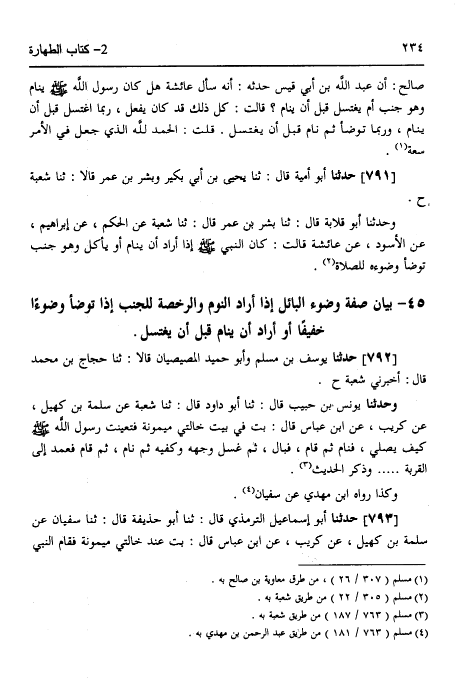 791 - حَدَّثَنَا أَبُو أُمَيَّةَ قَالَ: ثَنَا يَحْيَى بْنُ أَبِي بُكَيْرٍ، وَبِشْرُ بْنُ عُمَرَ قَالَا: ثَنَا شُعْبَةُ ح، وَحَدَّثَنَا أَبُو قِلَابَةَ قَالَ: ثَنَا بِشْرُ بْنُ عُمَرَ قَالَ: ثَنَا شُعْبَةُ، عَنِ الْحَكَمِ، عَنْ إِبْرَاهِيمَ، عَنِ الْأَسْوَدِ، عَنْ عَائِشَةَ قَالَتْ: «كَانَ النَّبِيُّ صَلَّى اللهُ عَلَيْهِ وَسَلَّمَ §إِذَا أَرَادَ أَنْ يَنَامَ أَوْ يَأْكُلَ وَهُوَ جُنُبٌ تَوَضَّأَ وُضُوءَهُ لِلصَّلَاةِ»