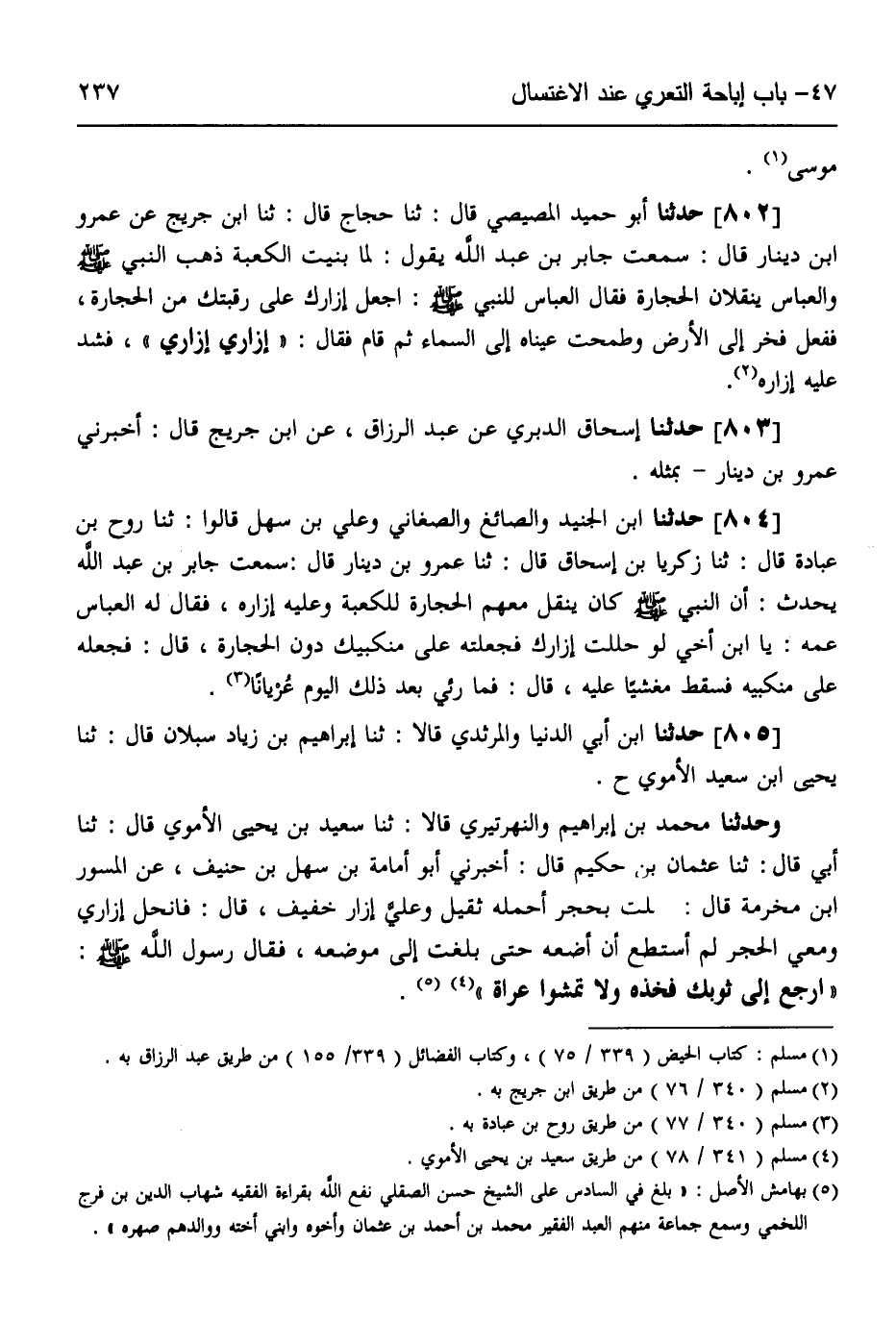 802 - حَدَّثَنَا أَبُو حُمَيْدٍ الْمِصِّيصِيُّ قَالَ: ثَنَا حَجَّاجٌ قَالَ: ثَنَا ابْنُ جُرَيْجٍ، عَنْ عَمْرِو بْنِ دِينَارٍ قَالَ: سَمِعْتُ جَابِرَ بْنَ عَبْدِ اللَّهِ يَقُولُ: " §لَمَّا بُنِيَتِ الْكَعْبَةُ ذَهَبَ النَّبِيُّ صَلَّى اللهُ عَلَيْهِ وَسَلَّمَ وَالْعَبَّاسُ يَنْقُلَانِ الْحِجَارَةَ، فَقَالَ الْعَبَّاسُ لِلنَّبِيِّ صَلَّى اللهُ عَلَيْهِ وَسَلَّمَ: اجْعَلْ إِزَارَكَ عَلَى رَقَبَتِكَ مِنَ الْحِجَارَةِ، فَفَعَلَ فَخَرَّ إِلَى الْأَرْضِ وَطَمَحَتْ عَيْنَاهُ إِلَى السَّمَاءِ، ثُمَّ قَامَ فَقَالَ: «إِزَارِي إِزَارِي» ، فَشَدَّ عَلَيْهِ إِزَارَهُ "