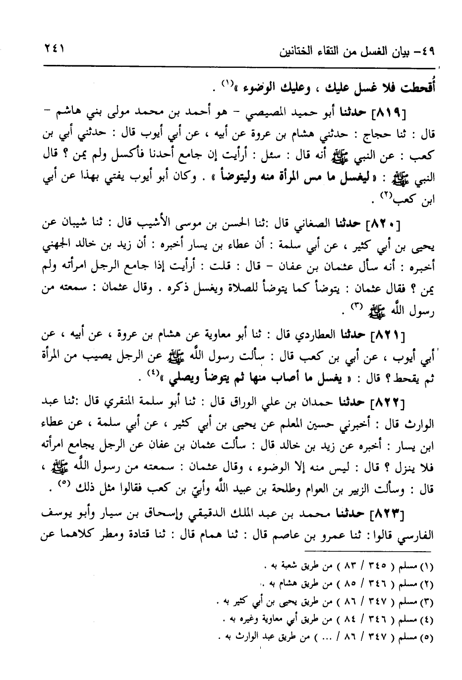 819 - حَدَّثَنَا أَبُو حُمَيْدٍ الْمِصِّيصِيُّ هُوَ أَحْمَدُ بْنُ مُحَمَّدٍ مَوْلَى بَنِي هَاشِمٍ قَالَ: ثَنَا حَجَّاجٌ، حَدَّثَنِي هِشَامُ بْنُ عُرْوَةَ، عَنْ أَبِيهِ، عَنْ أَبِي أَيُّوبَ قَالَ: حَدَّثَنِي أُبَيُّ بْنُ كَعْبٍ، عَنِ النَّبِيِّ صَلَّى اللهُ عَلَيْهِ وَسَلَّمَ أَنَّهُ قَالَ: سُئِلَ أَرَأَيْتَ إِنْ جَامَعَ أَحَدُنَا فَأَكْسَلَ وَلَمْ يُمْنِ؟ قَالَ النَّبِيُّ صَلَّى اللهُ عَلَيْهِ وَسَلَّمَ: «§لِيَغْسِلْ مَا مَسَّ الْمَرْأَةَ مِنْهُ وَلْيَتَوَضَّأْ» وَكَانَ أَبُو أَيُّوبَ يُفْتِي بِهَذَا، عَنْ أُبَيِّ بْنِ كَعْبٍ