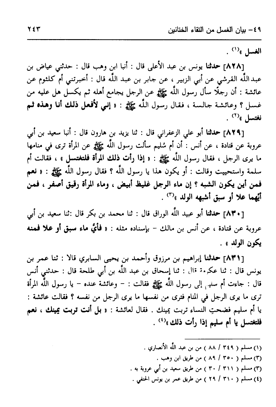 829 - حَدَّثَنَا أَبُو عَلِيٍّ الزَّعْفَرَانِيُّ قَالَ: ثَنَا يَزِيدُ بْنُ هَارُونَ قَالَ: أنبا سَعِيدُ بْنُ أَبِي عَرُوبَةَ، عَنْ قَتَادَةَ، عَنْ أَنَسٍ، أَنَّ أُمَّ سُلَيْمٍ سَأَلْتَ رَسُولَ اللَّهِ صَلَّى اللهُ عَلَيْهِ وَسَلَّمَ عَنِ الْمَرْأَةِ تَرَى فِي مَنَامِهَا مَا يَرَى الرَّجُلُ؟ فَقَالَ رَسُولُ اللَّهِ صَلَّى اللهُ عَلَيْهِ وَسَلَّمَ: «إِذَا رَأَتْ ذَلِكَ الْمَرْأَةُ فَلْتَغْتَسِلْ» ، فَقَالَتْ أُمُّ سَلَمَةَ: وَاسْتَحْيَيْتُ وَقَالَتْ: أَوَ يَكُونُ هَذَا يَا رَسُولَ اللَّهِ؟ فَقَالَ رَسُولُ اللَّهِ صَلَّى اللهُ عَلَيْهِ وَسَلَّمَ: «نَعَمْ، §فَمِنْ أَيْنَ يَكُونُ الشَّبَهُ؟ إِنَّ مَاءَ الرَّجُلِ غَلِيظٌ أَبْيَضُ، وَمَاءُ الْمَرْأَةِ رَقِيقٌ أَصْفَرُ، فَمِنْ أَيِّهِمَا عَلَا أَوْ سَبَقَ أَشْبَهَهُ الْوَلَدُ»