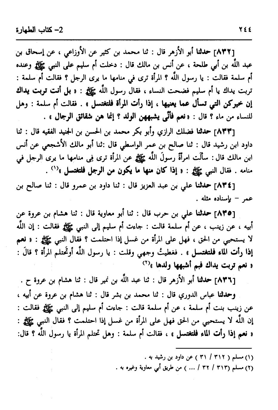 836 - حَدَّثَنَا أَبُو الْأَزْهَرِ قَالَ: ثَنَا عَبْدُ اللَّهِ بْنُ نُمَيْرٍ قَالَ: ثَنَا هِشَامُ بْنُ عُرْوَةَ ح، وَحَدَّثَنَا عَبَّاسٌ الدُّورِيُّ قَالَ: ثَنَا مُحَمَّدُ بْنُ بِشْرٍ قَالَ: ثَنَا هِشَامُ بْنُ عُرْوَةَ، عَنْ أَبِيهِ، عَنْ زَيْنَبَ بِنْتِ أُمِّ سَلَمَةَ، عَنْ أُمِّ سَلَمَةَ قَالَتْ: جَاءَتْ أُمُّ سُلَيْمٍ إِلَى النَّبِيِّ صَلَّى اللهُ عَلَيْهِ وَسَلَّمَ فَقَالَتْ: §إِنَّ اللَّهَ لَا يَسْتَحْيِي مِنَ الْحَقِّ فَهَلْ عَلَى الْمَرْأَةِ مِنْ غُسْلٍ إِذَا احْتَلَمَتْ؟ فَقَالَ النَّبِيُّ صَلَّى اللهُ عَلَيْهِ وَسَلَّمَ: «نَعَمْ. إِذَا رَأَتِ الْمَاءَ فَلْتَغْتَسِلْ» ، فَقَالَتْ أُمُّ سَلَمَةَ: وَهَلْ تَحْتَلِمُ الْمَرْأَةُ يَا رَسُولَ اللَّهِ؟ قَالَ -[245]-: «تَرِبَتْ يَمِينُكِ فَبِمَا يُشْبِهُهَا وَلَدُهَا»