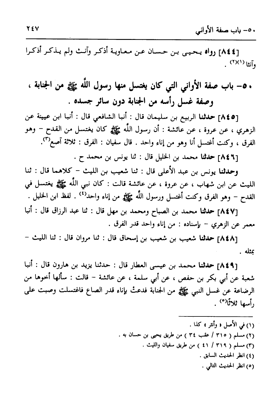 849 - حَدَّثَنَا مُحَمَّدُ بْنُ عِيسَى الْعَطَّارُ قَالَ: حَدَّثَنَا يَزِيدُ بْنُ هَارُونَ قَالَ: أنبا شُعْبَةُ، عَنْ أَبِي بَكْرِ بْنِ حَفْصٍ، عَنْ أَبِي سَلَمَةَ، عَنْ عَائِشَةَ قَالَتْ: «سَأَلَهَا أَخُوهَا مِنَ الرَّضَاعَةِ عَنْ §غُسْلِ النَّبِيِّ صَلَّى اللهُ عَلَيْهِ وَسَلَّمَ مِنَ الْجَنَابَةِ، فَدَعَتْ بِإِنَاءٍ قَدْرِ الصَّاعِ، فَاغْتَسَلَتْ وَصَبَّتْ عَلَى رَأْسِهَا ثَلَاثًا»