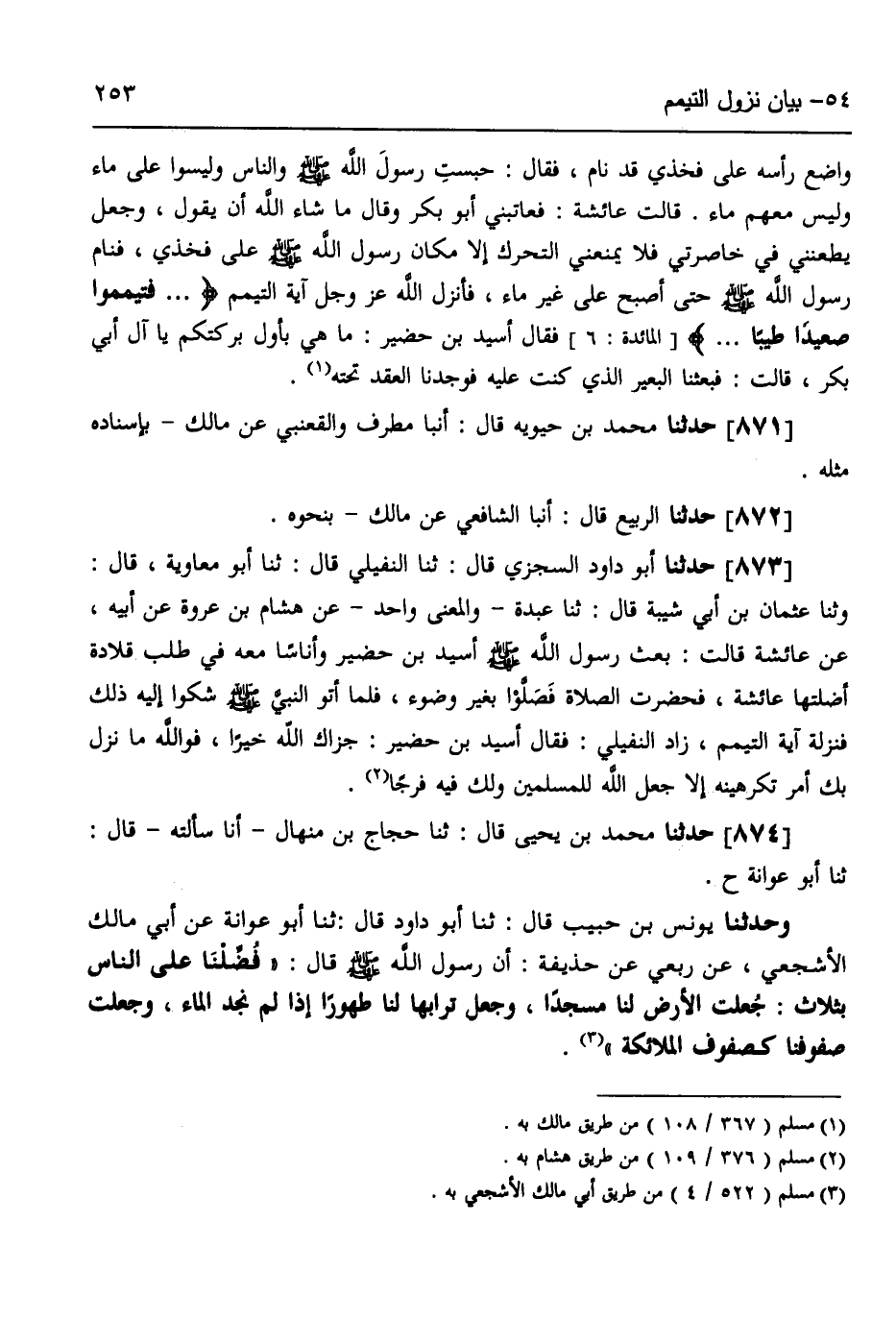 873 - حَدَّثَنَا أَبُو دَاوُدَ السِّجْزِيُّ قَالَ: ثَنَا النُّفَيْلِيُّ قَالَ: ثَنَا أَبُو مُعَاوِيَةَ قَالَ: وَثَنَا عُثْمَانُ بْنُ أَبِي شَيْبَةَ قَالَ: ثَنَا عَبْدَةُ وَالْمَعْنَى وَاحِدٌ، عَنْ هِشَامِ بْنِ عُرْوَةَ، عَنْ أَبِيهِ، عَنْ عَائِشَةَ قَالَتْ: بَعَثَ رَسُولُ اللَّهِ صَلَّى اللهُ عَلَيْهِ وَسَلَّمَ أُسَيْدَ بْنَ حُضَيْرٍ وَأُنَاسًا مَعَهُ فِي طَلَبِ قِلَادَةٍ أَضَلَّتْهَا عَائِشَةُ، §فَحَضَرَتِ الصَّلَاةُ فَصَلُّوا بِغَيْرِ وُضُوءٍ، فَلَمَّا أَتَوِ النَّبِيَّ صَلَّى اللهُ عَلَيْهِ وَسَلَّمَ شَكَوْا إِلَيْهِ ذَلِكَ فَنَزَلَتْ آيَةُ التَّيَمُّمِ " زَادَ النُّفَيْلِيُّ فَقَالَ: أُسَيْدُ بْنُ حُضَيْرٍ: جَزَاكِ اللَّهُ خَيْرًا فَوَاللَّهِ مَا نَزَلَ بِكِ أَمْرٌ تَكْرَهِينَهُ إِلَّا جَعَلَ اللَّهُ لِلْمُسْلِمِينَ وَلَكِ فِيهِ فَرَجًا