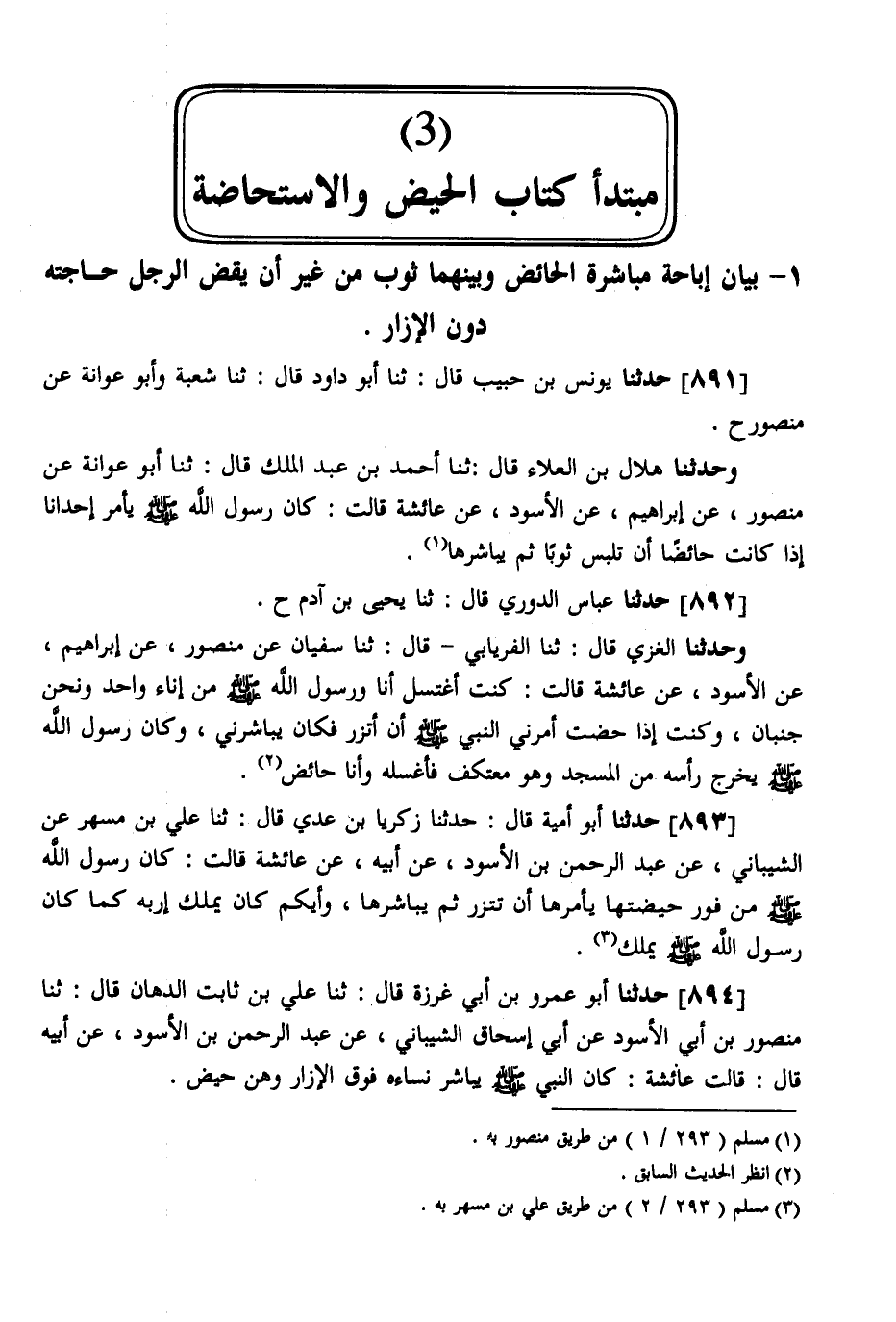894 - حَدَّثَنَا أَبُو عَمْرِو بْنُ أَبِي غَرَزَةَ قَالَ: ثَنَا عَلِيُّ بْنُ ثَابِتٍ الدَّهَّانُ قَالَ: ثَنَا مَنْصُورُ بْنُ أَبِي الْأَسْوَدِ، عَنْ أَبِي إِسْحَاقَ الشَّيْبَانِيِّ، عَنْ عَبْدِ الرَّحْمَنِ بْنِ الْأَسْوَدِ، عَنْ أَبِيهِ قَالَ: قَالَتْ عَائِشَةُ: «كَانَ النَّبِيُّ صَلَّى اللهُ عَلَيْهِ وَسَلَّمَ §يُبَاشِرُ نِسَاءَهُ فَوْقَ الْإِزَارِ وَهُنَّ حُيَّضٌ»