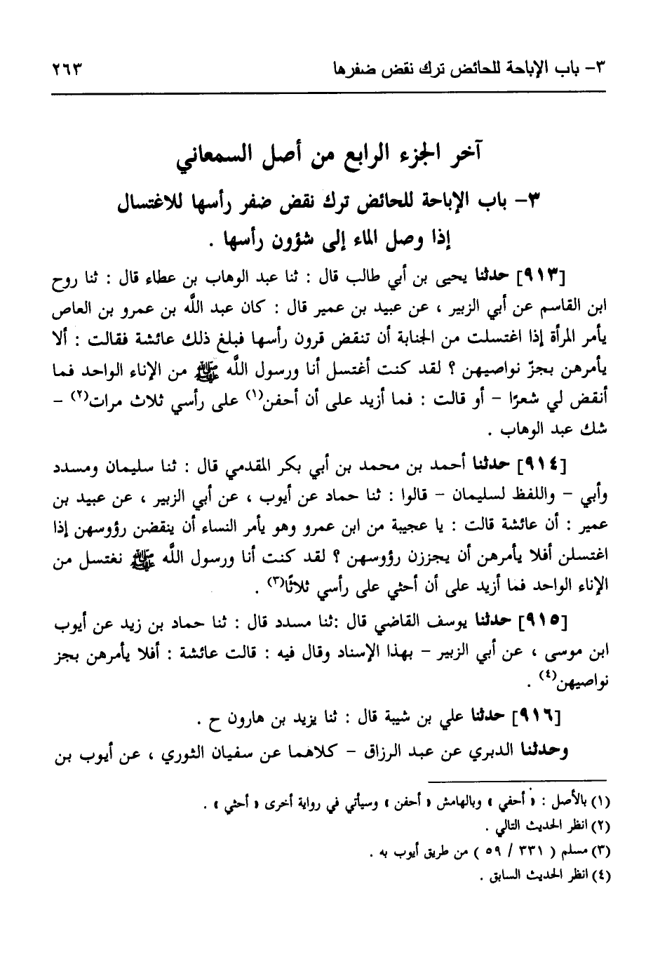 913 - حَدَّثَنَا يَحْيَى بْنُ أَبِي طَالِبٍ قَالَ: ثَنَا عَبْدُ الْوَهَّابِ بْنُ عَطَاءٍ قَالَ: ثَنَا رَوْحُ بْنُ الْقَاسِمِ، عَنْ أَبِي الزُّبَيْرِ، عَنْ عُبَيْدِ بْنِ عُمَيْرٍ قَالَ: كَانَ عَبْدُ اللَّهِ بْنُ عَمْرِو بْنِ الْعَاصِ يَأْمُرُ الْمَرْأَةَ إِذَا اغْتَسَلَتْ مِنَ الْجَنَابَةِ أَنْ تَنْقُضَ قُرُونَ رَأْسِهَا، فَبَلَغَ ذَلِكَ عَائِشَةَ فَقَالَتْ: أَلَا يَأْمُرُهُنَّ بِجَزِّ نَوَاصِيهِنَّ، لَقَدْ §كُنْتُ أَغْتَسِلُ أَنَا وَرَسُولُ اللَّهِ صَلَّى اللهُ عَلَيْهِ وَسَلَّمَ مِنَ الْإِنَاءِ الْوَاحِدِ فَمَا أَنْقُضُ لِي شَعْرًا " أَوْ قَالَتْ: فَمَا أَزِيدُ عَلَى أَنْ أَحْفِنَ عَلَى رَأْسِي ثَلَاثَ مَرَّاتٍ، شَكَّ عَبْدُ الْوَهَّابِ