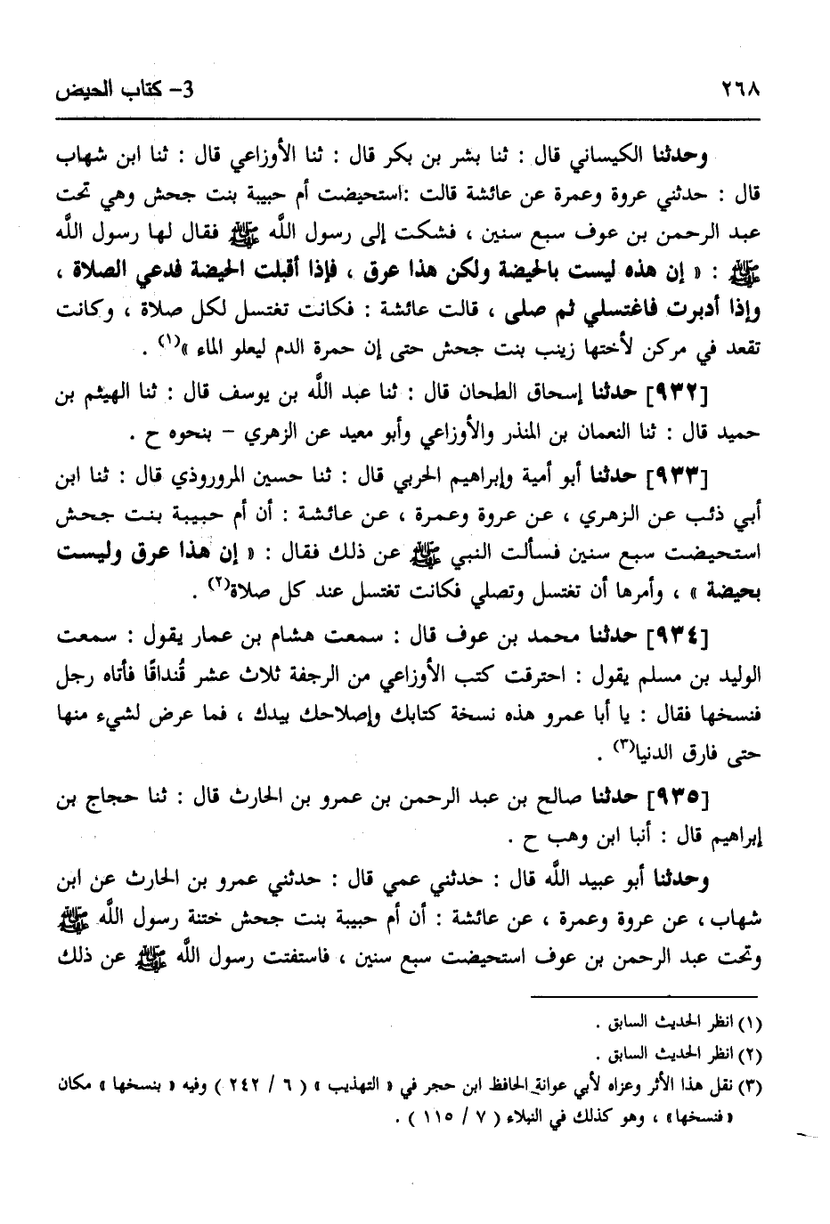 935 - حَدَّثَنَا صَالِحُ بْنُ عَبْدِ الرَّحْمَنِ بْنِ عَمْرِو بْنِ الْحَارِثِ قَالَ: ثَنَا حَجَّاجُ بْنُ إِبْرَاهِيمَ قَالَ: أنبا ابْنُ وَهْبٍ ح، وَحَدَّثَنَا أَبُو عُبَيْدِ اللَّهِ قَالَ: حَدَّثَنِي عَمِّي قَالَ: حَدَّثَنِي عَمْرُو بْنُ الْحَارِثِ، عَنِ ابْنِ شِهَابٍ، عَنْ عُرْوَةَ، وَعَمْرَةَ، عَنْ عَائِشَةَ، أَنَّ أُمَّ حَبِيبَةَ بِنْتَ جَحْشٍ خَتَنَةَ رَسُولِ اللَّهِ صَلَّى اللهُ عَلَيْهِ وَسَلَّمَ وَتَحْتَ عَبْدِ الرَّحْمَنِ بْنِ عَوْفٍ " اسْتُحِيضَتْ سَبْعَ سِنِينَ فَاسْتَفْتَتْ رَسُولَ اللَّهِ صَلَّى اللهُ عَلَيْهِ وَسَلَّمَ، عَنْ ذَلِكَ -[269]- فَقَالَ رَسُولُ اللَّهِ صَلَّى اللهُ عَلَيْهِ وَسَلَّمَ: «§إِنَّ هَذِهِ لَيْسَتْ بِالْحَيْضَةِ، وَلَكِنَّ هَذَا عِرْقٌ فَاغْتَسِلِي وَصَلِّي» قَالَتْ عَائِشَةُ: وَكَانَتْ تَغْتَسِلُ عِنْدَ كُلِّ صَلَاةٍ فِي مِرْكَنٍ فِي حُجْرَةِ أُخْتِهَا زَيْنَبَ بِنْتِ جَحْشٍ تَعْلُو حُمْرَةُ الدَّمِ الْمَاءَ