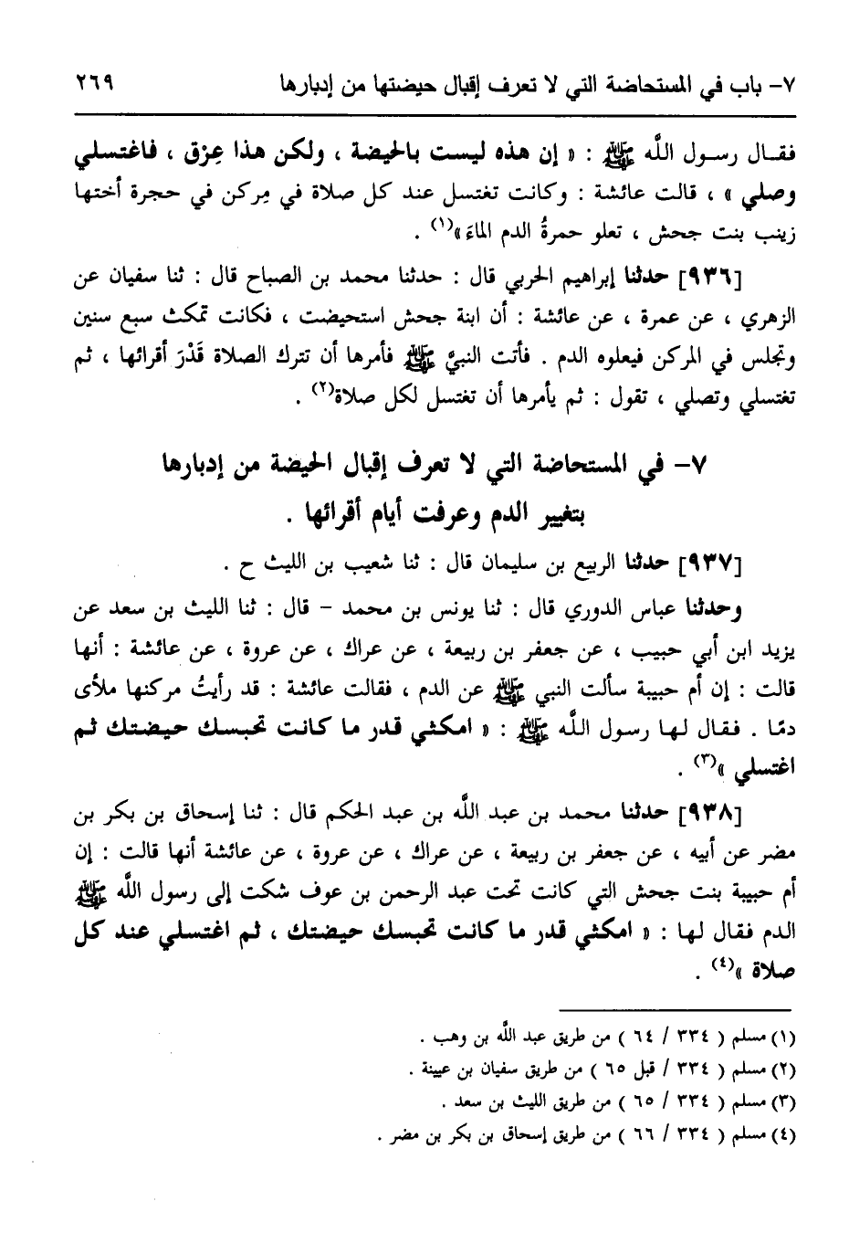 937 - حَدَّثَنَا الرَّبِيعُ بْنُ سُلَيْمَانَ قَالَ: ثَنَا شُعَيْبُ بْنُ اللَّيْثِ ح، وَحَدَّثَنَا عَبَّاسٌ الدُّورِيُّ قَالَ: ثَنَا يُونُسُ بْنُ مُحَمَّدٍ قَالَ: ثَنَا اللَّيْثُ بْنُ سَعْدٍ، عَنْ يَزِيدَ بْنِ أَبِي حَبِيبٍ، عَنْ جَعْفَرِ بْنِ رَبِيعَةَ، عَنْ عِرَاكٍ، عَنْ عُرْوَةَ، عَنْ عَائِشَةَ، أَنَّهَا قَالَتْ: إِنَّ أُمَّ حَبِيبَةَ سَأَلْتِ النَّبِيَّ صَلَّى اللهُ عَلَيْهِ وَسَلَّمَ عَنِ الدَّمِ فَقَالَتْ عَائِشَةُ: قَدْ رَأَيْتُ مِرْكَنَهَا مَلْأَى دَمًا، فَقَالَ لَهَا رَسُولُ اللَّهِ صَلَّى اللهُ عَلَيْهِ وَسَلَّمَ: «§امْكُثِي قَدْرَ مَا كَانَتْ تَحْبِسُكِ حَيْضَتُكِ ثُمَّ اغْتَسِلِي»