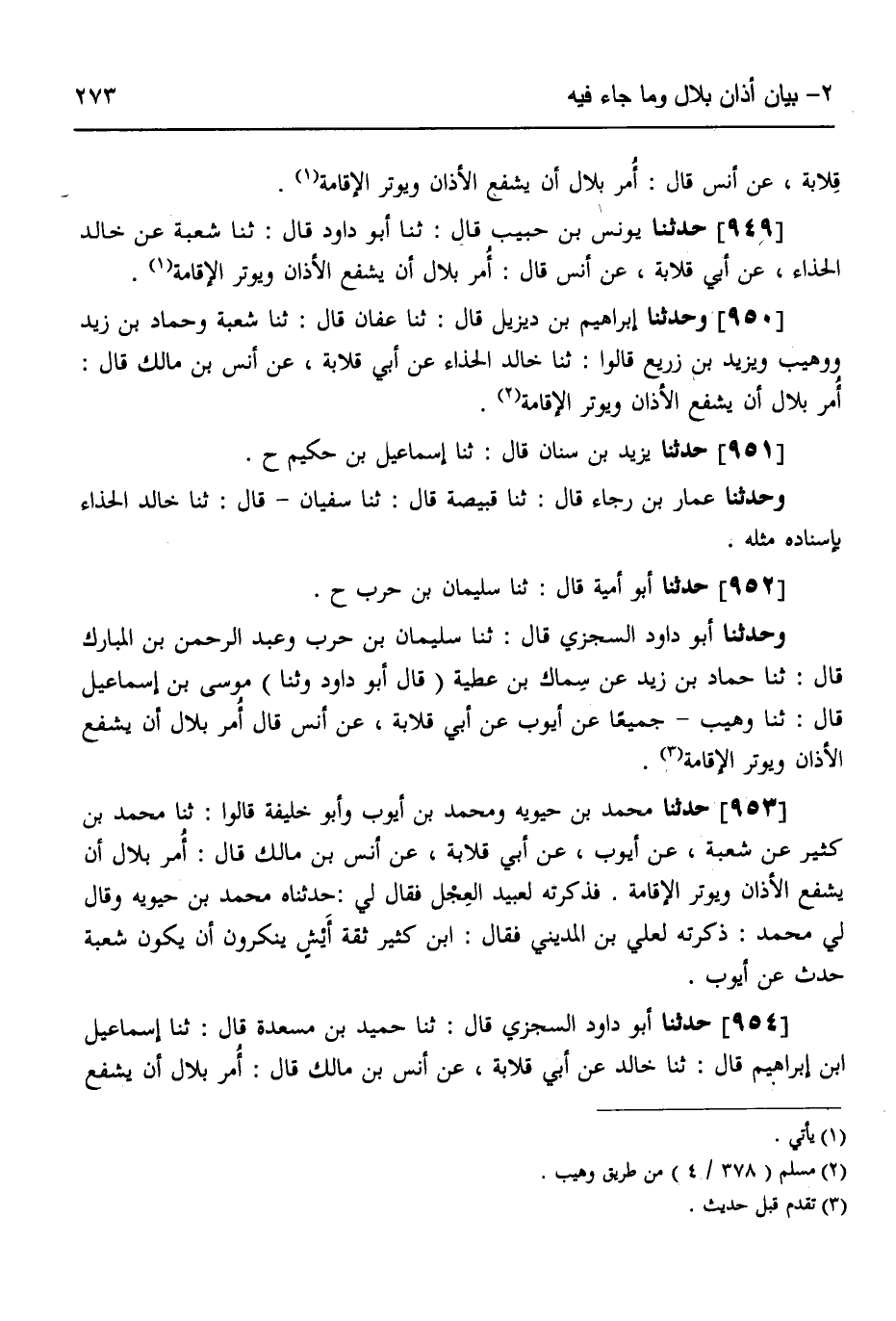 952 - حَدَّثَنَا أَبُو أُمَيَّةَ قَالَ: ثَنَا سُلَيْمَانُ بْنُ حَرْبٍ ح، وَحَدَّثَنَا أَبُو دَاوُدَ السِّجْزِيُّ قَالَ: ثَنَا سُلَيْمَانُ بْنُ حَرْبٍ، وَعَبْدُ الرَّحْمَنِ بْنُ الْمُبَارَكِ قَالَ: ثَنَا حَمَّادُ بْنُ زَيْدٍ، عَنْ سِمَاكِ بْنِ عَطِيَّةَ قَالَ أَبُو دَاوُدَ: وَثَنَا مُوسَى بْنُ إِسْمَاعِيلَ قَالَ: ثَنَا وُهَيْبٌ جَمِيعًا، عَنْ أَيُّوبَ، عَنْ أَبِي قِلَابَةَ، عَنْ أَنَسٍ قَالَ: «§أُمِرَ بِلَالٌ أَنْ يَشْفَعَ الْأَذَانَ وَيُوتِرَ الْإِقَامَةَ»
