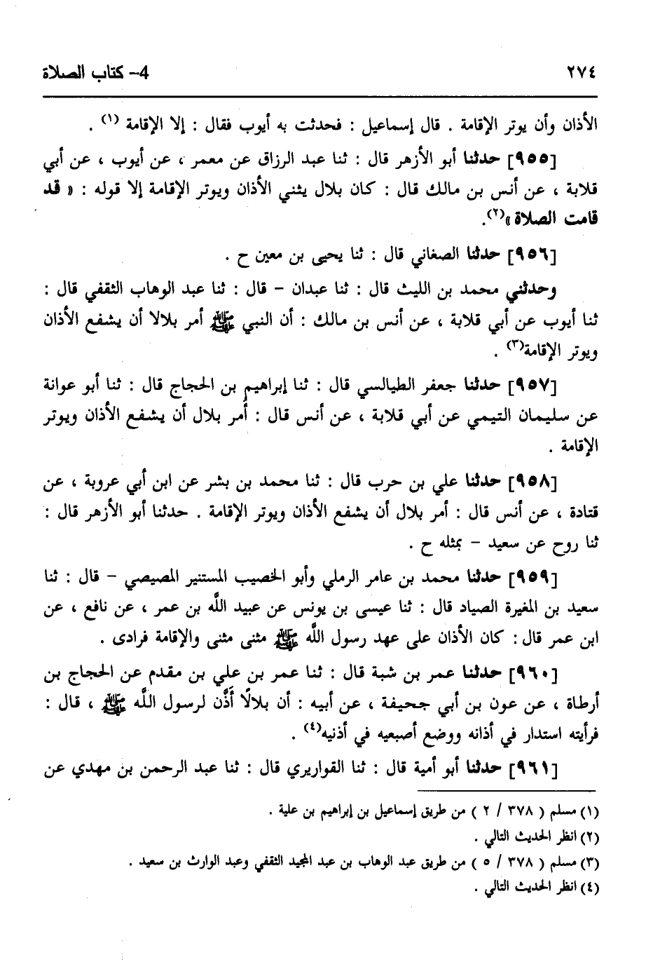 956 - حَدَّثَنَا الصَّغَانِيُّ قَالَ: ثَنَا يَحْيَى بْنُ مَعِينٍ ح، وَحَدَّثَنِي مُحَمَّدُ بْنُ اللَّيْثِ قَالَ: ثَنَا عَبْدَانُ قَالَ: ثَنَا عَبْدُ الْوَهَّابِ الثَّقَفِيُّ قَالَ: ثَنَا أَيُّوبُ، عَنْ أَبِي قِلَابَةَ، عَنْ أَنَسِ بْنِ مَالِكٍ، أَنَّ النَّبِيَّ صَلَّى اللهُ عَلَيْهِ وَسَلَّمَ «§أَمَرَ بِلَالًا أَنْ يَشْفَعَ الْأَذَانَ وَيُوتِرَ الْإِقَامَةَ»