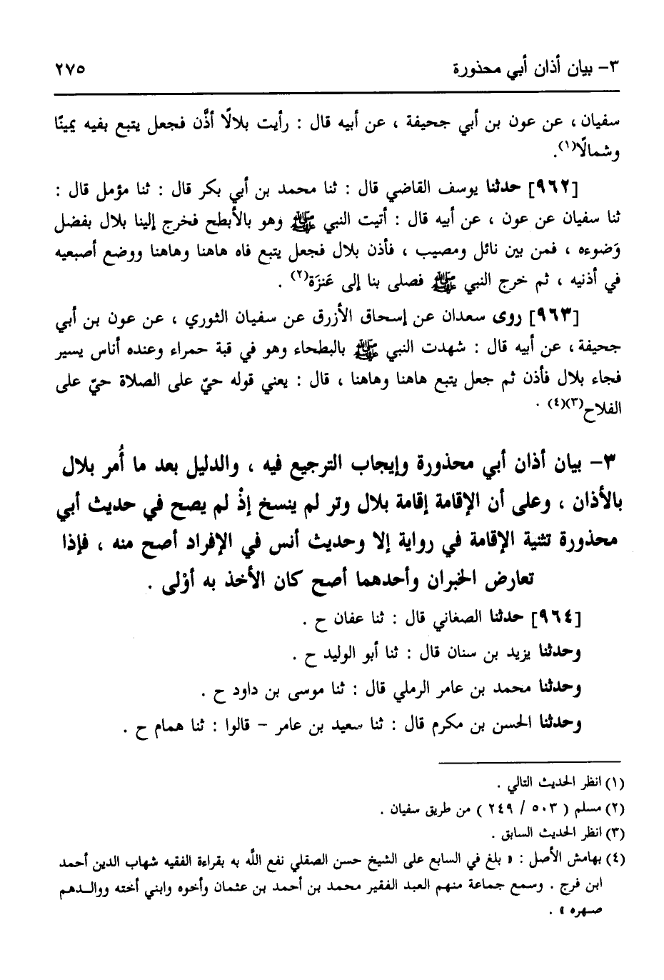 964 - حَدَّثَنَا الصَّغَانِيُّ قَالَ: ثَنَا عَفَّانُ ح، وَحَدَّثَنَا يَزِيدُ بْنُ سِنَانٍ قَالَ: ثَنَا أَبُو الْوَلِيدِ ح، وَحَدَّثَنَا مُحَمَّدُ بْنُ عَامِرٍ الرَّمْلِيُّ قَالَ: ثَنَا مُوسَى بْنُ دَاوُدَ ح، وَحَدَّثَنَا الْحَسَنُ بْنُ مُكْرَمٍ قَالَ: ثَنَا سَعِيدُ بْنُ عَامِرٍ قَالُوا: ثَنَا هَمَّامٌ ح -[276]-، وَحَدَّثَنَا مُحَمَّدُ بْنُ حَيَّوَيْهِ قَالَ: أنبا عَلِيُّ بْنُ الْمَدِينِيِّ قَالَ: ثَنَا مُعَاذُ بْنُ هِشَامٍ، عَنْ أَبِيهِ كِلَاهُمَا، عَنْ عَامِرٍ الْأَحْوَلِ قَالَ: حَدَّثَنِي مَكْحُولٌ، أَنَّ عَبْدَ اللَّهِ بْنَ مُحَيْرِيزٍ حَدَّثَهُ، أَنَّ أَبَا مَحْذُورَةَ حَدَّثَهُ، أَنَّ نَبِيَّ اللَّهِ صَلَّى اللهُ عَلَيْهِ وَسَلَّمَ " §عَلَّمَهُ هَذَا الْأَذَانَ: اللَّهُ أَكْبَرُ أَللَّهُ أَكْبَرُ، اللَّهُ أَكْبَرُ، اللَّهُ أَكْبَرُ، أَشْهَدُ أَنْ لَا إِلَهَ إِلَّا اللَّهُ، أَشْهَدُ أَنْ لَا إِلَهَ إِلَّا اللَّهُ، أَشْهَدُ أَنَّ مُحَمَّدًا رَسُولُ اللَّهِ، أَشْهَدُ أَنَّ مُحَمَّدًا رَسُولُ اللَّهِ، ثُمَّ يَعُودُ فَيَقُولُ: أَشْهَدُ أَنْ لَا إِلَهَ إِلَّا اللَّهُ، أَشْهَدُ أَنْ لَا إِلَهَ إِلَّا اللَّهُ، أَشْهَدُ أَنَّ مُحَمَّدًا رَسُولُ اللَّهِ، أَشْهَدُ أَنَّ مُحَمَّدًا رَسُولُ اللَّهِ - مَرَّتَيْنِ - حَيَّ عَلَى الصَّلَاةِ - مَرَّتَيْنِ - حَيَّ عَلَى الْفَلَاحِ - مَرَّتَيْنِ - اللَّهُ أَكْبَرُ اللَّهُ أَكْبَرُ، لَا إِلَهَ إِلَّا اللَّهُ " هَذَا لَفْظُ هِشَامٍ وَزَادَ هَمَّامٌ فِي حَدِيثِهِ ذِكْرَ الْإِقَامَةِ فَتَرَكْتُهُ؛ لِأَنَّ هِشَامًا أَحْفَظُ وَأَتْقَنُ مِنْهُ، وَلِأَنَّ إِجْمَاعَ أَهْلِ الْحَرَمَيْنِ عَلَى خِلَافِ زِيَادَتِهِ