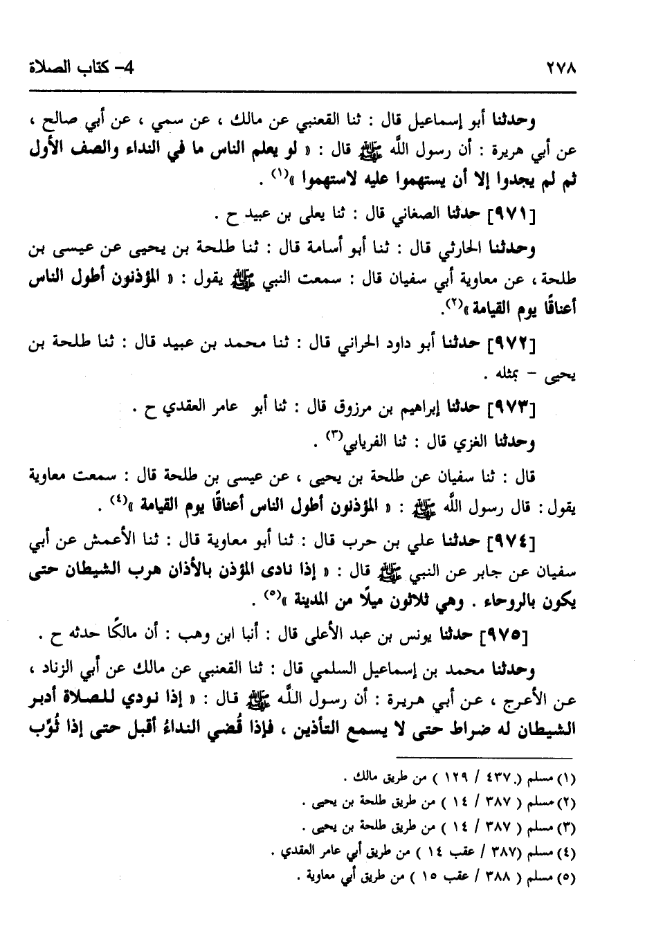 971 - حَدَّثَنَا الصَّغَانِيُّ قَالَ: ثَنَا يَعْلَى بْنُ عُبَيْدٍ ح، وَحَدَّثَنَا الْحَارِثِيُّ قَالَ: ثَنَا أَبُو أُسَامَةَ قَالَ: ثَنَا طَلْحَةُ بْنُ يَحْيَى، عَنْ عِيسَى بْنِ طَلْحَةَ، عَنْ مُعَاوِيَةَ أَبِي سُفْيَانَ قَالَ: سَمِعْتُ النَّبِيَّ صَلَّى اللهُ عَلَيْهِ وَسَلَّمَ يَقُولُ: «§الْمُؤَذِّنُونَ أَطْوَلُ النَّاسِ أَعْنَاقًا يَوْمَ الْقِيَامَةِ»