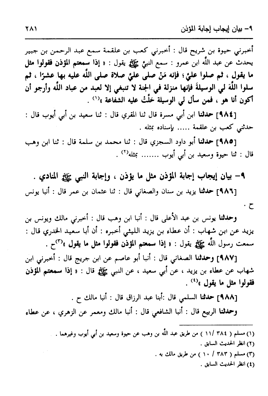 986 - حَدَّثَنَا يَزِيدُ بْنُ سِنَانٍ، وَالصَّغَانِيُّ قَالَ: ثَنَا عُثْمَانُ بْنُ عُمَرَ قَالَ: أنبا يُونُسُ ح، وَحَدَّثَنَا يُونُسُ بْنُ عَبْدِ الْأَعْلَى قَالَ: أنبا ابْنُ وَهْبٍ قَالَ: أَخْبَرَنِي مَالِكٌ، وَيُونُسُ بْنُ يَزِيدَ، عَنِ ابْنِ شِهَابٍ، أَنَّ عَطَاءَ بْنَ يَزِيدَ اللَّيْثِيَّ أَخْبَرَهُ، أَنَّ أَبَا سَعِيدٍ الْخُدْرِيَّ قَالَ: سَمِعْتُ رَسُولَ اللَّهِ صَلَّى اللهُ عَلَيْهِ وَسَلَّمَ يَقُولُ: «§إِذَا سَمِعْتُمُ الْمُؤَذِّنَ فَقُولُوا مِثْلَ مَا يَقُولُ»