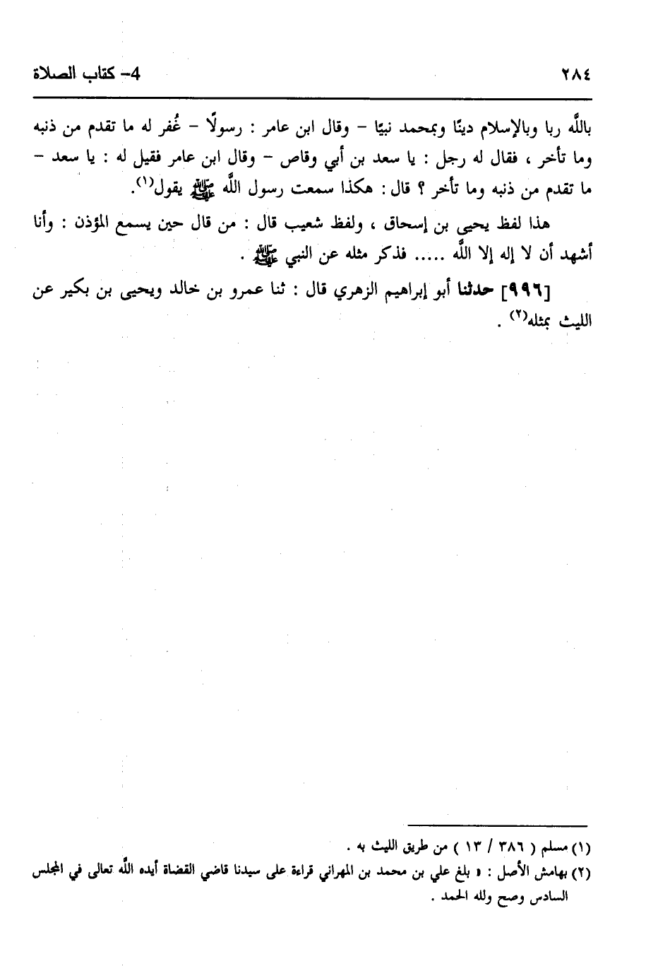 995- حَدَّثَنَا الرَّبِيعُ بْنُ سُلَيْمَانَ ، قَالَ : حَدَّثَنَا شُعَيْبُ بْنُ اللَّيْثِ (ح) وَحَدَّثَنَا الصَّغَانِيُّ ، وَمُحَمَّدُ بْنُ عَامِرٍ ، قَالَ : حَدَّثَنَا يَحْيَى بْنُ إِسْحَاقَ السَّالَحِينِيُّ ، قَالَ : حَدَّثَنَا اللَّيْثُ بْنُ سَعْدٍ ، عَنِ الْحُكَيْمِ بْنِ عَبْدِ اللهِ بْنِ قَيْسٍ ، عَنْ عَامِرِ بْنِ سَعْدٍ ، عَنْ سَعْدِ بْنِ أَبِي وَقَّاصٍ ، قَالَ : قَالَ رَسُولُ اللهِ صَلَّى اللهُ عَلَيهِ وَسَلَّمَ : مَنْ سَمِعَ الْمُؤَذِّنَ ، قَالَ : وَقَالَ ابْنُ عَامِرٍ مَنْ قَالَ : حِينَ يَسْمَعُ الْمُؤَذِّنَ : أَشْهَدُ أَنْ لاَ إِلَهَ إِلاَّ اللَّهُ ، قَالَ : أَشْهَدُ أَنْ لاَ إِلَهَ إِلاَّ اللَّهُ ، رَضِيتُ بِاللَّهِ رَبًّا وَبِالإِسْلاَمِ دِينًا وَبِمُحَمَّدٍ نَبِيًّا ، وَقَالَ ابْنُ عَامِرٍ : رَسُولاً ، غُفِرَ لَهُ مَا تَقَدَّمَ مِنْ ذَنْبِهِ وَمَا تَأَخَّرَ.