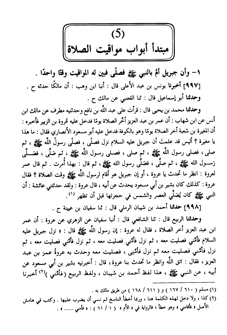 998 - حَدَّثَنَا أَحْمَدُ بْنُ شَيْبَانَ الرَّمْلِيُّ قَالَ: ثَنَا سُفْيَانُ بْنُ عُيَيْنَةَ ح، وَحَدَّثَنَا الرَّبِيعُ قَالَ: ثَنَا الشَّافِعِيُّ قَالَ: أنبا سُفْيَانُ، عَنِ الزُّهْرِيِّ، عَنْ عُرْوَةَ، أَنَّ عُمَرَ بْنَ عَبْدِ الْعَزِيزِ أَخَّرَ الصَّلَاةَ، فَقَالَ لَهُ عُرْوَةُ إِنَّ رَسُولَ اللَّهِ صَلَّى اللهُ عَلَيْهِ وَسَلَّمَ قَالَ: «§نَزَلَ جِبْرِيلُ عَلَيْهِ السَّلَامُ فَأَمَّنِي فَصَلَّيْتُ مَعَهُ، ثُمَّ نَزَلَ فَأَمَّنِي فَصَلَّيْتُ مَعَهُ، ثُمَّ نَزَلَ فَأَمَّنِي فَصَلَّيْتُ مَعَهُ، ثُمَّ نَزَلَ فَأَمَّنِي فَصَلَّيْتُ مَعَهُ، ثُمَّ نَزَلَ فَأَمَّنِي فَصَلَّيْتُ مَعَهُ» وَحَدَّثَ بِهِ عُرْوَةُ عُمَرَ بْنَ عَبْدِ الْعَزِيزِ فَقَالَ: اتَّقِ اللَّهَ وَانْظُرْ مَا تُحَدِّثُ بِنَا عُرْوَةُ قَالَ: أَخْبَرَنِيهِ بَشِيرُ بْنُ أَبِي مَسْعُودٍ، عَنْ أَبِيهِ، عَنِ النَّبِيِّ صَلَّى اللهُ عَلَيْهِ وَسَلَّمَ، هَذَا لَفْظُ أَحْمَدَ بْنِ شَيْبَانَ، وَلَفْظُ الرَّبِيعِ فَأَمَّنِي، أَخْبَرَنَا -[286]- سُفْيَانُ، عَنِ الزُّهْرِيِّ قَالَ: أَخَّرَ عُمَرُ بْنُ عَبْدِ الْعَزِيزِ الصَّلَاةَ فَقَالَ لَهُ عُرْوَةُ: إِنَّ رَسُولَ اللَّهِ صَلَّى اللهُ عَلَيْهِ وَسَلَّمَ قَالَ: «نَزَلَ جِبْرِيلُ فَأَمَّنِي فَصَلَّيْتُ مَعَهُ»