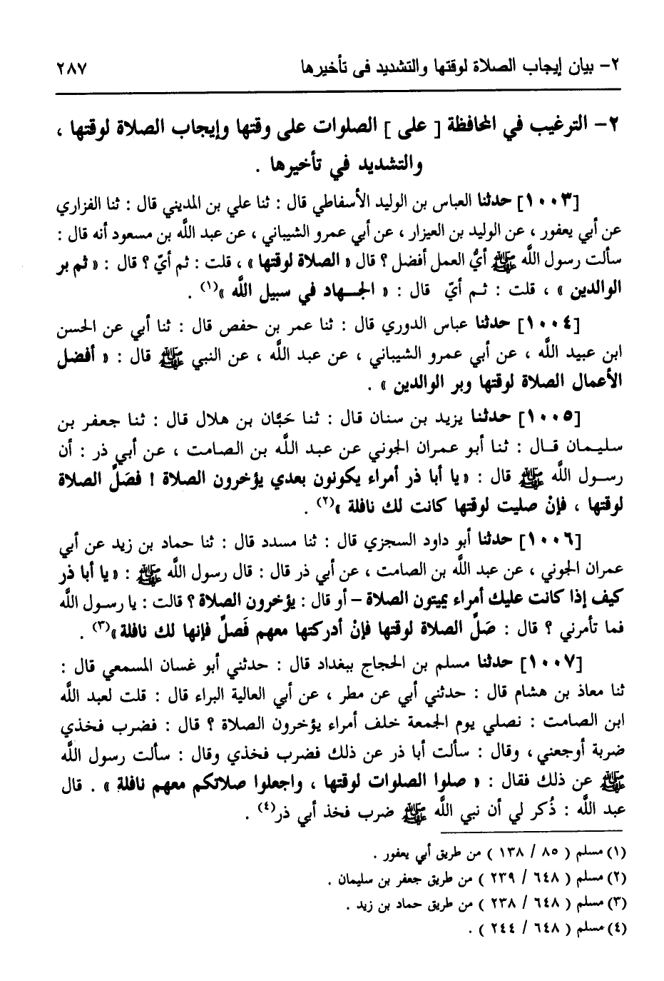 1007 - حَدَّثَنَا مُسْلِمُ بْنُ الْحَجَّاجِ بِبَغْدَادَ قَالَ: حَدَّثَنِي أَبُو غَسَّانَ الْمِسْمَعِيُّ قَالَ: ثَنَا مُعَاذُ بْنُ هِشَامٍ قَالَ: حَدَّثَنِي أَبِي، عَنْ مَطَرٍ، عَنْ أَبِي الْعَالِيَةِ الْبَرَاءِ قَالَ: قُلْتُ لِعَبْدِ اللَّهِ بْنِ الصَّامِتِ نُصَلِّي يَوْمَ الْجُمُعَةِ خَلْفَ أُمَرَاءَ يُؤَخِّرُونَ الصَّلَاةَ؟ قَالَ: فَضَرَبَ فَخِذِي ضَرْبَةً أَوْجَعَنِي، وَقَالَ سَأَلْتُ أَبَا ذَرٍّ عَنْ ذَلِكَ، فَضَرَبَ فَخِذِي وَقَالَ: سَأَلْتُ رَسُولَ اللَّهِ صَلَّى اللهُ عَلَيْهِ وَسَلَّمَ عَنْ ذَلِكَ فَقَالَ: «§صَلُّوا الصَّلَوَاتِ لِوَقْتِهَا وَاجْعَلُوا صَلَاتَكُمْ مَعَهُمْ نَافِلَةً» قَالَ عَبْدُ اللَّهِ: ذُكِرَ لِي أَنَّ نَبِيَّ اللَّهِ صَلَّى اللهُ عَلَيْهِ وَسَلَّمَ ضَرَبَ فَخِذَ أَبِي ذَرٍّ