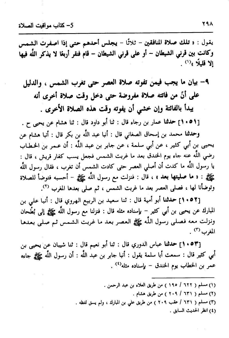 1051 - حَدَّثَنَا عَمَّارُ بْنُ رَجَاءٍ قَالَ: ثَنَا أَبُو دَاوُدَ قَالَ: ثَنَا هِشَامٌ، عَنْ يَحْيَى ح، وَحَدَّثَنَا مُحَمَّدُ بْنُ إِسْحَاقَ الصَّغَانِيُّ قَالَ: أنبا عَبْدُ اللَّهِ بْنُ بَكْرٍ قَالَ: أنبا هِشَامٌ، عَنْ يَحْيَى بْنِ أَبِي كَثِيرٍ، عَنْ أَبِي سَلَمَةَ، عَنْ جَابِرِ بْنِ عَبْدِ اللَّهِ، أَنَّ عُمَرَ بْنَ الْخَطَّابِ رَضِيَ اللَّهُ عَنْهُ، جَاءَ يَوْمَ الْخَنْدَقِ بَعْدَ مَا غَرَبَتِ الشَّمْسُ فَجَعَلَ يَسُبُّ كُفَّارَ قُرَيْشٍ قَالَ: يَا رَسُولَ اللَّهِ مَا كِدْتُ أَنْ أُصَلِّيَ الْعَصْرَ حَتَّى كَادَتِ الشَّمْسُ أَنْ تَغْرُبَ، فَقَالَ رَسُولُ اللَّهِ صَلَّى اللهُ عَلَيْهِ وَسَلَّمَ: «مَا صَلَّيْتُهَا بَعْدُ» ، قَالَ: فَنَزَلْتُ مَعَ رَسُولِ اللَّهِ صَلَّى اللهُ عَلَيْهِ وَسَلَّمَ أَحْسَبُهُ فَتَوَضَّأَ لِلصَّلَاةِ وَتَوَضَّأْنَا لَهَا §فَصَلَّى الْعَصْرَ بَعْدَ مَا غَرَبَتِ الشَّمْسُ، ثُمَّ صَلَّى بَعْدَهَا الْمَغْرِبَ "