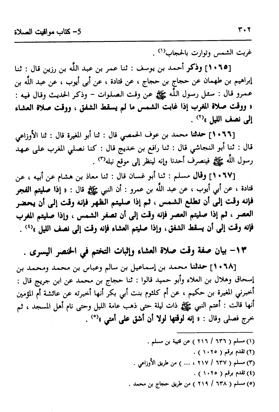1067 - وَقَالَ مُسْلِمٌ: ثَنَا أَبُو غَسَّانَ قَالَ: ثَنَا مُعَاذُ بْنُ هِشَامٍ، عَنْ أَبِيهِ، عَنْ قَتَادَةَ، عَنْ أَبِي أَيُّوبَ، عَنْ عَبْدِ اللَّهِ بْنِ عَمْرٍو، أَنَّ النَّبِيَّ صَلَّى اللهُ عَلَيْهِ وَسَلَّمَ قَالَ: «§إِذَا صَلَّيْتُمُ الْفَجْرَ فَإِنَّهُ وَقْتٌ إِلَى أَنْ تَطْلُعَ الشَّمْسُ، ثُمَّ إِذَا صَلَّيْتُمُ الظُّهْرَ فَإِنَّهُ وَقْتٌ إِلَى أَنْ يَحْضُرَ الْعَصْرُ، ثُمَّ إِذَا صَلَّيْتُمُ الْعَصْرَ فَإِنَّهُ وَقْتٌ إِلَى أَنْ تَصْفَرَّ الشَّمْسُ، وَإِذَا صَلَّيْتُمُ الْمَغْرِبَ فَإِنَّهُ وَقْتٌ إِلَى أَنْ يَسْقُطَ الشَّفَقُ، وَإِذَا صَلَّيْتُمُ الْعِشَاءَ فَإِنَّهُ وَقْتٌ إِلَى نِصْفِ اللَّيْلِ»