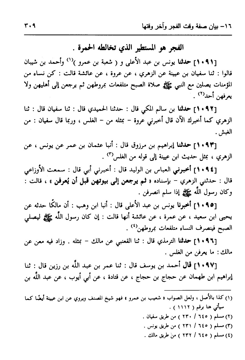 1091 - حَدَّثَنَا يُونُسُ بْنُ عَبْدِ الْأَعْلَى، وَشُعْبَةُ بْنُ عَمْرٍو، وَأَحْمَدُ بْنُ شَيْبَانَ قَالُوا: ثَنَا سُفْيَانُ بْنُ عُيَيْنَةَ، عَنِ الزُّهْرِيِّ، عَنْ عُرْوَةَ، عَنْ عَائِشَةَ قَالَتْ: «§كُنَّ نِسَاءٌ مِنَ الْمُؤْمِنَاتِ يُصَلِّيْنَ مَعَ النَّبِيِّ صَلَّى اللهُ عَلَيْهِ وَسَلَّمَ صَلَاةَ الصُّبْحِ مُتَلَفِّعَاتٍ بِمُرُوطِهِنَّ، ثُمَّ يَرْجِعْنَ إِلَى أَهْلِيهِنَّ وَلَا يَعْرِفُهُنَّ أَحَدٌ»