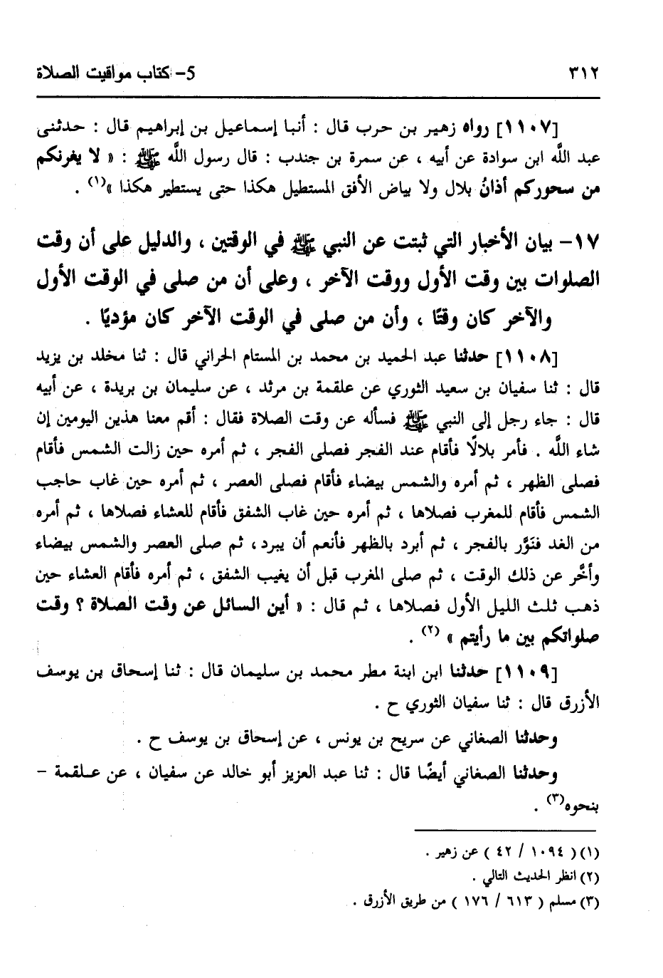 1107 - رَوَاهُ زُهَيْرُ بْنُ حَرْبٍ قَالَ: أنبا إِسْمَاعِيلُ بْنُ إِبْرَاهِيمَ قَالَ: حَدَّثَنِي عَبْدُ اللَّهِ بْنُ سَوَادَةَ، عَنْ أَبِيهِ، عَنْ سَمُرَةَ بْنِ جُنْدُبٍ قَالَ رَسُولُ اللَّهِ صَلَّى اللهُ عَلَيْهِ وَسَلَّمَ: «§لَا يَغُرَّنَّكُمْ مِنْ سُحُورِكُمْ أَذَانُ بِلَالٍ وَلَا بَيَاضُ الْأُفُقِ الْمُسْتَطِيلُ هَكَذَا حَتَّى يَسْتَطِيرَ هَكَذَا»