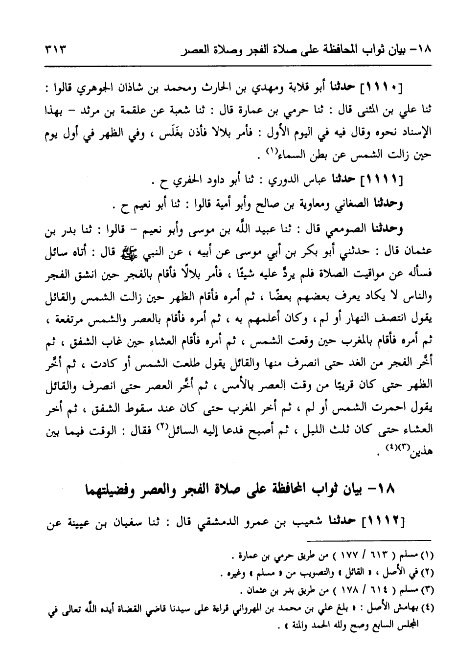 1112 - حَدَّثَنَا شُعَيْبُ بْنُ عَمْرٍو الدِّمَشْقِيُّ قَالَ: ثَنَا سُفْيَانُ بْنُ عُيَيْنَةَ، عَنْ -[314]- إِسْمَاعِيلَ ح، وَحَدَّثَنَا عَلِيُّ بْنُ حَرْبٍ، وَمُحَمَّدُ بْنُ إِسْحَاقَ الْبَكَّائِيُّ، وَعَمَّارُ بْنُ رَجَاءٍ قَالُوا: ثَنَا يَعْلَى بْنُ عُبَيْدٍ قَالَ: ثَنَا إِسْمَاعِيلُ بْنُ أَبِي خَالِدٍ، عَنْ قَيْسِ بْنِ أَبِي حَازِمٍ، عَنْ جَرِيرِ بْنِ عَبْدِ اللَّهِ قَالَ: كُنْتُ عِنْدَ النَّبِيِّ صَلَّى اللهُ عَلَيْهِ وَسَلَّمَ فَنَظَرَ إِلَى الْقَمَرِ لَيْلَةَ الْبَدْرِ فَقَالَ: «§إِنَّكُمْ سَتَرَوْنَ رَبَّكُمْ كَمَا تَرَوْنَ هَذَا لَا تُضَامُونَ فِي رُؤْيَتِهِ، فَإِنِ اسْتَطَعْتُمْ أَنْ لَا تُغْلَبُوا عَلَى صَلَاةٍ قَبْلَ طُلُوعِ الشَّمْسِ وَقَبْلَ غُرُوبِهَا فَلْيُفْعَلْ»