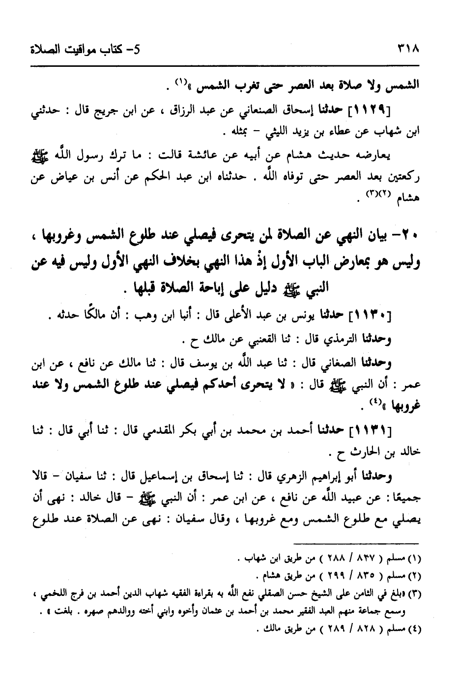 1130 - حَدَّثَنَا يُونُسُ بْنُ عَبْدِ الْأَعْلَى قَالَ: أنبا ابْنُ وَهْبٍ، أَنَّ مَالِكًا، حَدَّثَهُ وَحَدَّثَنَا التِّرْمِذِيُّ قَالَ: ثَنَا الْقَعْنَبِيُّ، عَنْ مَالِكٍ ح، وَحَدَّثَنَا الصَّغَانِيُّ قَالَ: ثَنَا عَبْدُ اللَّهِ بْنُ يُوسُفَ قَالَ: ثَنَا مَالِكٌ، عَنْ نَافِعٍ، عَنِ ابْنِ عُمَرَ، أَنَّ النَّبِيَّ صَلَّى اللهُ عَلَيْهِ وَسَلَّمَ قَالَ: «§لَا يَتَحَرَّى أَحَدُكُمْ فَيُصَلِّي عِنْدَ طُلُوعِ الشَّمْسِ وَلَا عِنْدَ غُرُوبِهَا»