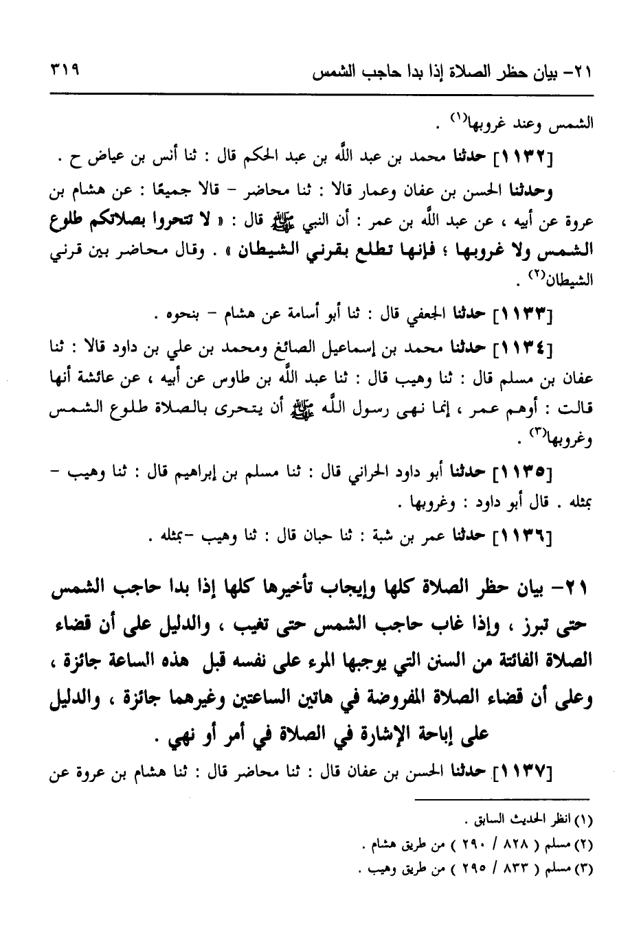 1137 - حَدَّثَنَا الْحَسَنُ بْنُ عَفَّانَ قَالَ: ثَنَا مُحَاضِرٌ قَالَ: ثَنَا هِشَامُ بْنُ عُرْوَةَ، عَنْ -[320]- أَبِيهِ، عَنْ عَبْدِ اللَّهِ بْنِ عُمَرَ، أَنَّ رَسُولَ اللَّهِ صَلَّى اللهُ عَلَيْهِ وَسَلَّمَ قَالَ: «§إِذَا بَرَزَ حَاجِبُ الشَّمْسِ فَدَعُوا الصَّلَاةَ حَتَّى تَسْتَوِيَ، وَإِذَا غَابَ حَاجِبُ الشَّمْسِ فَدَعُوا الصَّلَاةَ حَتَّى تَغِيبَ»