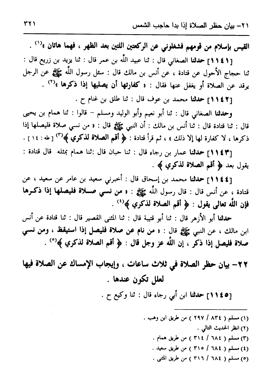1142 - حَدَّثَنَا مُحَمَّدُ بْنُ عَوْفٍ قَالَ: ثَنَا طَلْقُ بْنُ غَنَّامٍ ح، وَحَدَّثَنَا الصَّغَانِيُّ قَالَ: ثَنَا أَبُو نُعَيْمٍ، وَأَبُو الْوَلِيدِ، وَمُسْلِمٌ قَالُوا: ثَنَا هَمَّامُ بْنُ يَحْيَى قَالَ: ثَنَا قَتَادَةُ قَالَ: ثَنَا أَنَسُ بْنُ مَالِكٍ، أَنَّ النَّبِيَّ صَلَّى اللهُ عَلَيْهِ وَسَلَّمَ قَالَ: «§مَنْ نَسِيَ صَلَاةً فَلْيُصَلِّهَا إِذَا ذَكَرَهَا، لَا كَفَّارَةَ لَهَا إِلَّا ذَلِكَ» ، ثُمَّ قَرَأَ قَتَادَةُ: {أَقِمِ الصَّلَاةَ لِذِكْرِي} [طه: 14]