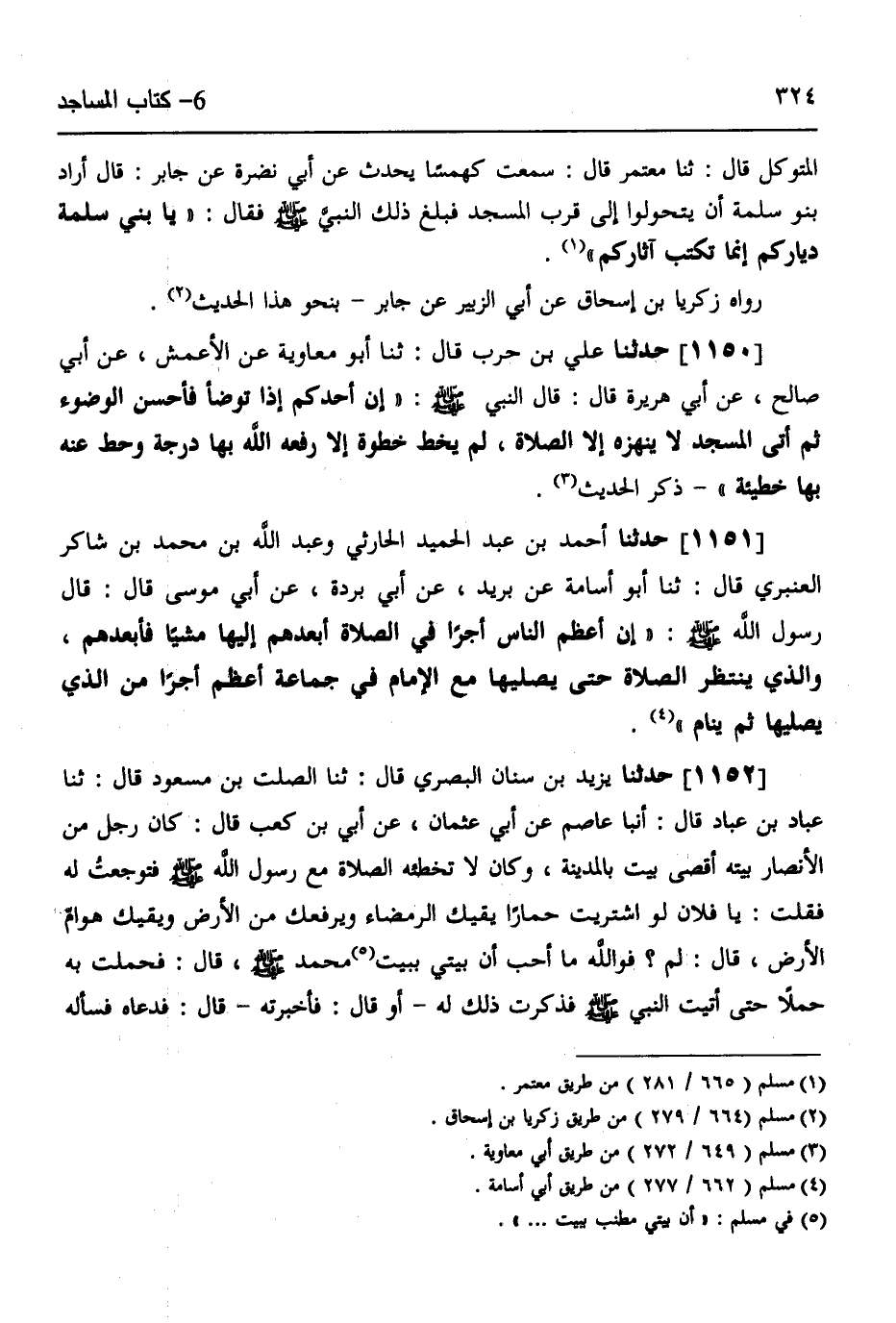 1152 - حَدَّثَنَا يَزِيدُ بْنُ سِنَانٍ الْبَصْرِيُّ قَالَ: ثَنَا الصَّلْتُ بْنُ مَسْعُودٍ قَالَ: ثَنَا عَبَّادُ بْنُ عَبَّادٍ قَالَ: أنبا عَاصِمٌ، عَنْ أَبِي عُثْمَانَ، عَنْ أُبَيِّ بْنِ كَعْبٍ قَالَ: كَانَ رَجُلٌ مِنَ الْأَنْصَارِ بَيْتُهُ أَقْصَى بَيْتٍ بِالْمَدِينَةِ وَكَانَ لَا تُخْطِئُهُ الصَّلَاةُ مَعَ رَسُولِ اللَّهِ صَلَّى اللهُ عَلَيْهِ وَسَلَّمَ فَتَوَجَّعْتُ لَهُ فَقُلْتُ: " يَا فُلَانُ لَوِ اشْتَرَيْتَ حِمَارًا يَقِيكَ الرَّمْضَاءَ وَيَرْفَعُكَ مِنَ الْأَرْضِ وَيَقِيكَ هَوَامَّ الْأَرْضِ، قَالَ: لِمَ؟ فَوَاللَّهِ مَا أُحِبُّ أَنَّ بَيْتِي بِبَيْتِ مُحَمَّدٍ صَلَّى اللهُ عَلَيْهِ وَسَلَّمَ، قَالَ: فَحَمَلْتُ بِهِ حِمْلًا حَتَّى أَتَيْتُ النَّبِيَّ صَلَّى اللهُ عَلَيْهِ وَسَلَّمَ فَذَكَرْتُ ذَلِكَ لَهُ - أَوْ قَالَ: فَأَخْبَرْتُهُ - قَالَ: فَدَعَاهُ فَسَأَلَهُ -[325]- وَذَكَرَ مِثْلَ ذَلِكَ فَذَكَرَ أَنَّهُ يَرْجُو فِي أَثَرِهِ الْأَجْرَ، فَقَالَ رَسُولُ اللَّهِ صَلَّى اللهُ عَلَيْهِ وَسَلَّمَ: «§إِنَّ لَكَ مَا احْتَسَبْتَ» رَوَاهُ ابْنُ عُيَيْنَةَ، عَنْ عَاصِمٍ
