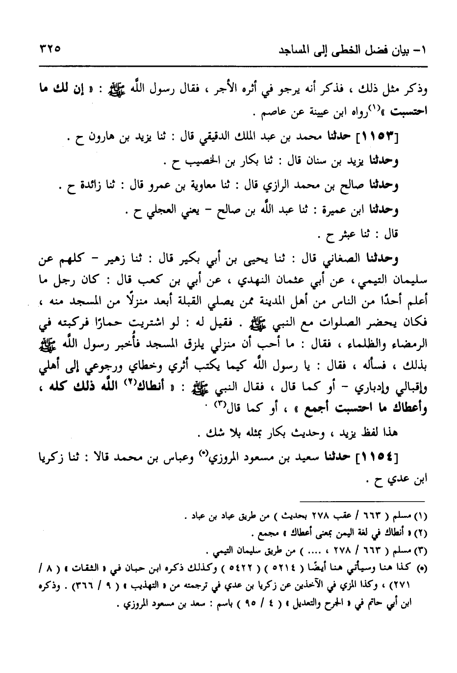 1153 - حَدَّثَنَا مُحَمَّدُ بْنُ عَبْدِ الْمَلِكِ الدَّقِيقِيُّ قَالَ: ثَنَا يَزِيدُ بْنُ هَارُونَ ح، وَحَدَّثَنَا يَزِيدُ بْنُ سِنَانٍ قَالَ: ثَنَا بَكَّارُ بْنُ الْخَصِيبِ ح، وَحَدَّثَنَا صَالِحُ بْنُ مُحَمَّدٍ الرَّازِيُّ قَالَ: ثَنَا مُعَاوِيَةُ بْنُ عَمْرٍو قَالَ: ثَنَا زَائِدَةُ ح، وَحَدَّثَنَا ابْنُ عَمِيرَةَ، ثَنَا عَبْدُ اللَّهِ بْنُ صَالِحٍ يَعْنِي الْعِجْلِيَّ ح قَالَ: ثَنَا عَبْثَرٌ ح، وَحَدَّثَنَا الصَّغَانِيُّ قَالَ: ثَنَا يَحْيَى بْنُ أَبِي بُكَيْرٍ قَالَ: ثَنَا زُهَيْرٌ كُلُّهُمْ، عَنْ سُلَيْمَانَ التَّيْمِيِّ، عَنْ أَبِي عُثْمَانَ النَّهْدِيِّ، عَنْ أُبَيِّ بْنِ كَعْبٍ قَالَ: كَانَ رَجُلٌ مَا أَعْلَمُ أَحَدًا مِنَ النَّاسِ مِنْ أَهْلِ الْمَدِينَةِ مِمَّنْ يُصَلِّي الْقِبْلَةَ أَبْعَدَ مَنْزِلًا مِنَ الْمَسْجِدِ مِنْهُ، فَكَانَ يَحْضُرُ الصَّلَوَاتِ مَعَ النَّبِيِّ صَلَّى اللهُ عَلَيْهِ وَسَلَّمَ فَقِيلَ لَهُ: " §لَوِ اشْتَرَيْتَ حِمَارًا فَرَكِبْتَهُ فِي الرَّمْضَاءِ وَالظَّلْمَاءِ فَقَالَ: مَا أُحِبُّ أَنَّ مَنْزِلِي يَلْزَقُ الْمَسْجِدَ. فَأُخْبِرَ رَسُولُ اللَّهِ صَلَّى اللهُ عَلَيْهِ وَسَلَّمَ بِذَلِكَ فَسَأَلَهُ، فَقَالَ: يَا رَسُولَ اللَّهِ كَيْمَا يُكْتَبَ أَثَرِي وَخُطَايَ وَرُجُوعِي إِلَى أَهْلِي وَإِقْبَالِي وَإِدْبَارِي - أَوْ كَمَا قَالَ - فَقَالَ النَّبِيُّ صَلَّى اللهُ عَلَيْهِ وَسَلَّمَ: «أَنْطَاكَ اللَّهُ ذَلِكَ كُلَّهُ وَأَعْطَاكَ مَا احْتَسَبْتَ أَجْمَعَ» أَوْ كَمَا قَالَ. هَذَا لَفْظُ يَزِيدَ وَحَدِيثُ بَكَّارٍ بِمِثْلِهِ بِلَا شَكٍّ