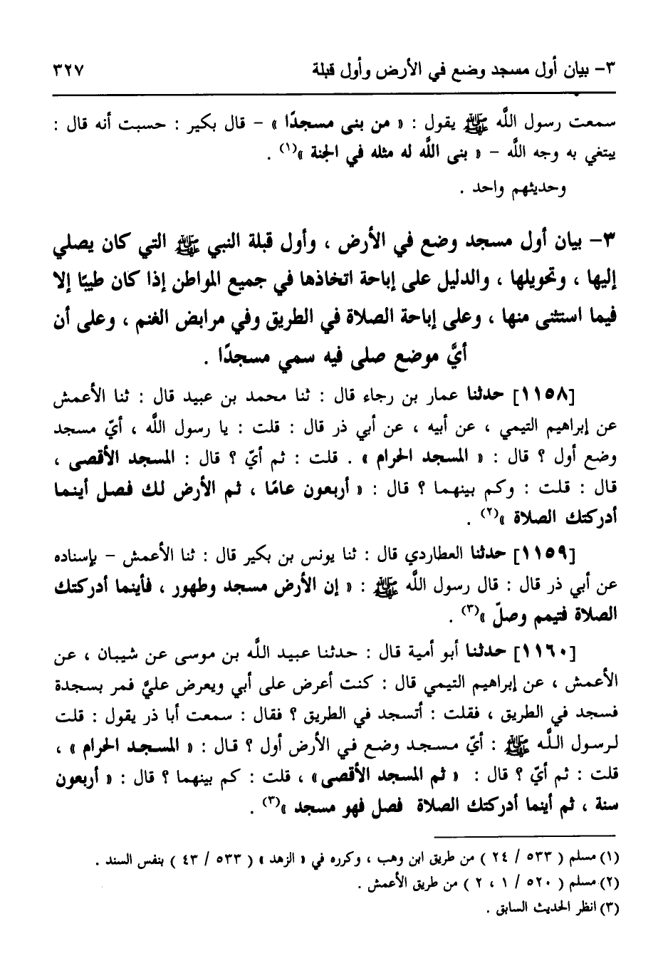1160 - حَدَّثَنَا أَبُو أُمَيَّةَ قَالَ: حَدَّثَنَا عُبَيْدُ اللَّهِ بْنُ مُوسَى، عَنْ شَيْبَانَ، عَنِ الْأَعْمَشِ، عَنْ إِبْرَاهِيمَ التَّيْمِيِّ قَالَ: كُنْتُ أَعْرِضُ عَلَى أَبِي وَيَعْرِضُ عَلَيَّ، فَمَرَّ بِسَجْدَةٍ فَسَجَدَ فِي الطَّرِيقِ فَقُلْتُ: أَتَسْجُدُ فِي الطَّرِيقِ؟ فَقَالَ: سَمِعْتُ أَبَا ذَرٍّ يَقُولُ: قُلْتُ لِرَسُولِ اللَّهِ صَلَّى اللهُ عَلَيْهِ وَسَلَّمَ: " §أَيُّ مَسْجِدٍ وُضِعَ فِي الْأَرْضِ أَوَّلُ؟ قَالَ: «الْمَسْجِدُ الْحَرَامُ» ، قُلْتُ: ثُمَّ أَيُّ؟ قَالَ: «ثُمَّ الْمَسْجِدُ الْأَقْصَى» ، قُلْتُ: كَمْ بَيْنَهُمَا؟ قَالَ: «أَرْبَعُونَ سَنَةً، ثُمَّ أَيْنَمَا أَدْرَكَتْكَ الصَّلَاةُ فَصَلِّ فَهُوَ مَسْجِدٌ»
