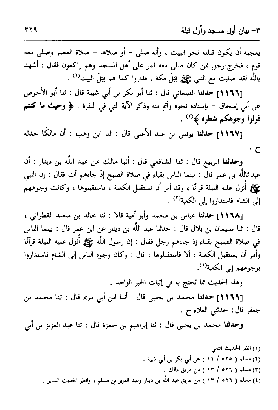 1167 - حَدَّثَنَا يُونُسُ بْنُ عَبْدِ الْأَعْلَى قَالَ: ثَنَا ابْنُ وَهْبٍ، أَنَّ مَالِكًا، حَدَّثَهُ ح، وَحَدَّثَنَا الرَّبِيعُ قَالَ: ثَنَا الشَّافِعِيُّ قَالَ: أنبا مَالِكٌ، عَنْ عَبْدِ اللَّهِ بْنِ دِينَارٍ، أَنَّ عَبْدَ اللَّهِ بْنَ عُمَرَ قَالَ: " §بَيْنَمَا النَّاسُ بِقُبَاءَ فِي صَلَاةِ الصُّبْحِ إِذْ جَاءَهُمْ آتٍ فَقَالَ: إِنَّ النَّبِيَّ صَلَّى اللهُ عَلَيْهِ وَسَلَّمَ أُنْزِلَ عَلَيْهِ اللَّيْلَةَ قُرْآنٌ وَقَدْ أَمَرَ أَنْ نَسْتَقْبِلَ الْكَعْبَةَ فَاسْتَقْبِلُوهَا وَكَانَتْ وُجُوهُهُمْ إِلَى الشَّامِ فَاسْتَدَارُوا إِلَى الْكَعْبَةِ "