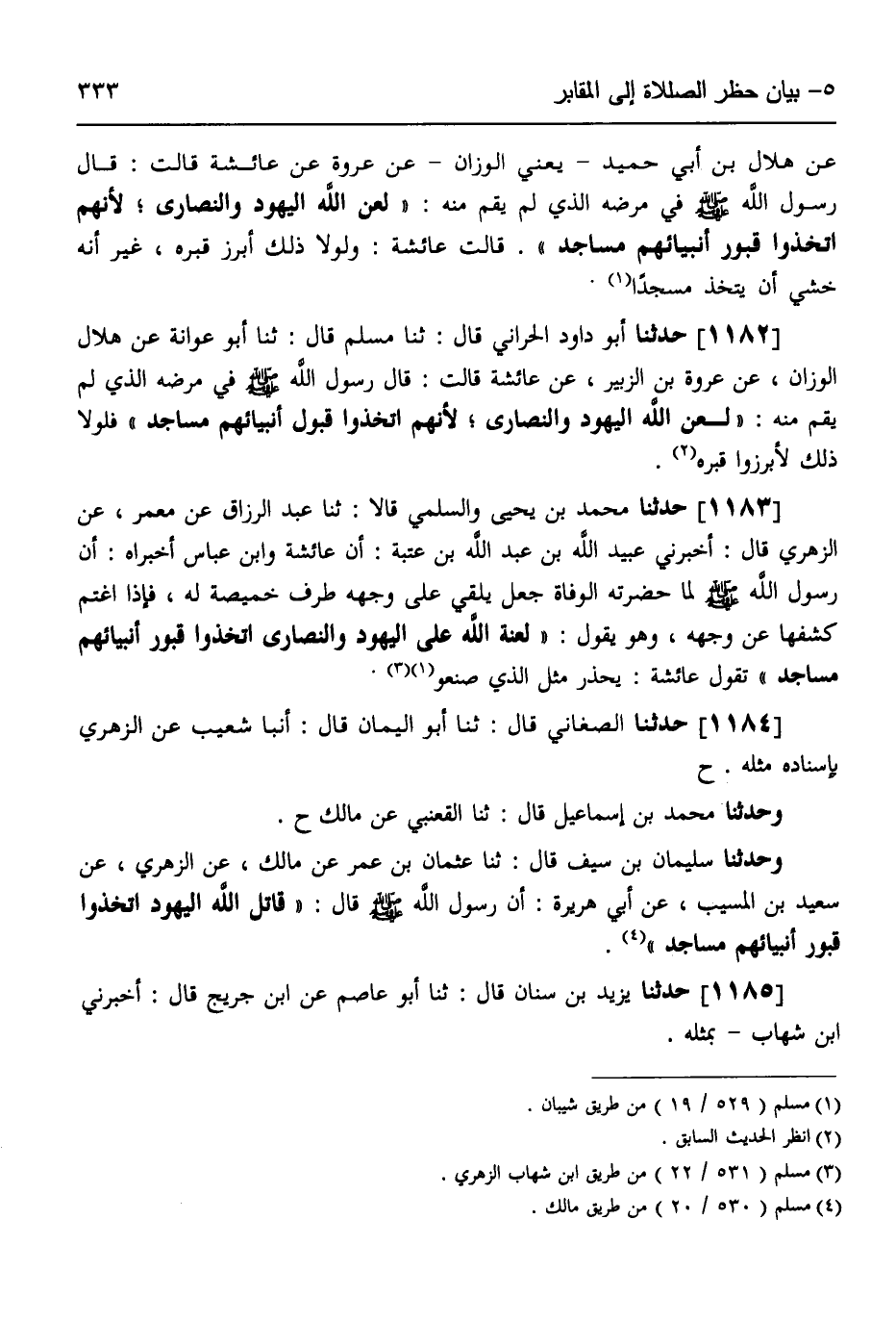 1184 - حَدَّثَنَا الصَّغَانِيُّ قَالَ: ثَنَا أَبُو الْيَمَانِ قَالَ: أنبا شُعَيْبٌ، عَنِ الزُّهْرِيِّ، بِإِسْنَادِهِ مِثْلَهُ ح، وَحَدَّثَنَا مُحَمَّدُ بْنُ إِسْمَاعِيلَ قَالَ: ثَنَا الْقَعْنَبِيُّ، عَنْ مَالِكٍ ح، وَحَدَّثَنَا سُلَيْمَانُ بْنُ سَيْفٍ قَالَ: ثَنَا عُثْمَانُ بْنُ عُمَرَ، عَنْ مَالِكٍ، عَنِ الزُّهْرِيِّ، عَنْ سَعِيدِ بْنِ الْمُسَيِّبِ، عَنْ أَبِي هُرَيْرَةَ، أَنَّ رَسُولَ اللَّهِ صَلَّى اللهُ عَلَيْهِ وَسَلَّمَ قَالَ: «§قَاتَلَ اللَّهُ الْيَهُودَ اتَّخَذُوا قُبُورَ أَنْبِيَائِهِمْ مَسَاجِدَ»