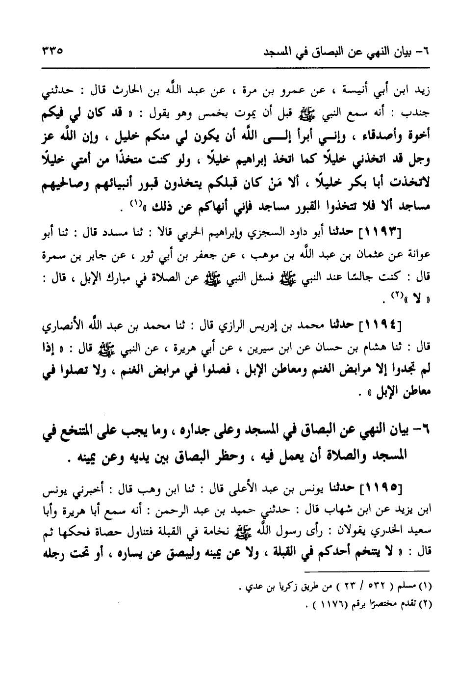 1193 - حَدَّثَنَا أَبُو دَاوُدَ السِّجْزِيُّ، وَإِبْرَاهِيمُ الْحَرْبِيُّ قَالَا: ثَنَا مُسَدَّدٌ قَالَ: ثَنَا أَبُو عَوَانَةَ، عَنْ عُثْمَانَ بْنِ عَبْدِ اللَّهِ بْنِ مَوْهَبٍ، عَنْ جَعْفَرِ بْنِ أَبِي ثَوْرٍ، عَنْ جَابِرِ بْنِ سَمُرَةَ قَالَ: كُنْتُ جَالِسًا عِنْدَ النَّبِيِّ صَلَّى اللهُ عَلَيْهِ وَسَلَّمَ " §فَسُئِلَ النَّبِيُّ صَلَّى اللهُ عَلَيْهِ وَسَلَّمَ عَنِ الصَّلَاةِ فِي مَبَارِكِ الْإِبِلِ؟ قَالَ: «لَا»