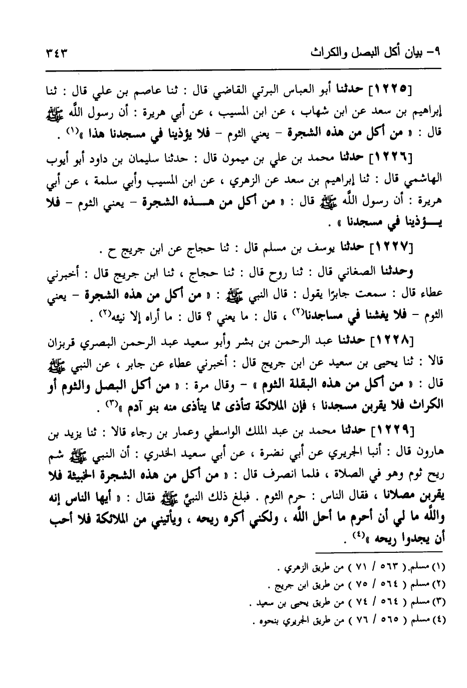 1225 - حَدَّثَنَا أَبُو الْعَبَّاسِ الْبِرْتِيُّ الْقَاضِي قَالَ: ثَنَا عَاصِمُ بْنُ عَلِيٍّ قَالَ: ثَنَا إِبْرَاهِيمُ بْنُ سَعْدٍ، عَنِ ابْنِ شِهَابٍ، عَنِ ابْنِ الْمُسَيِّبِ، عَنْ أَبِي هُرَيْرَةَ، أَنَّ رَسُولَ اللَّهِ صَلَّى اللهُ عَلَيْهِ وَسَلَّمَ قَالَ: «§مَنْ أَكَلَ مِنْ هَذِهِ الشَّجَرَةِ - يَعْنِي الثُّومُ - فَلَا يُؤْذِينَا فِي مَسْجِدِنَا هَذَا»